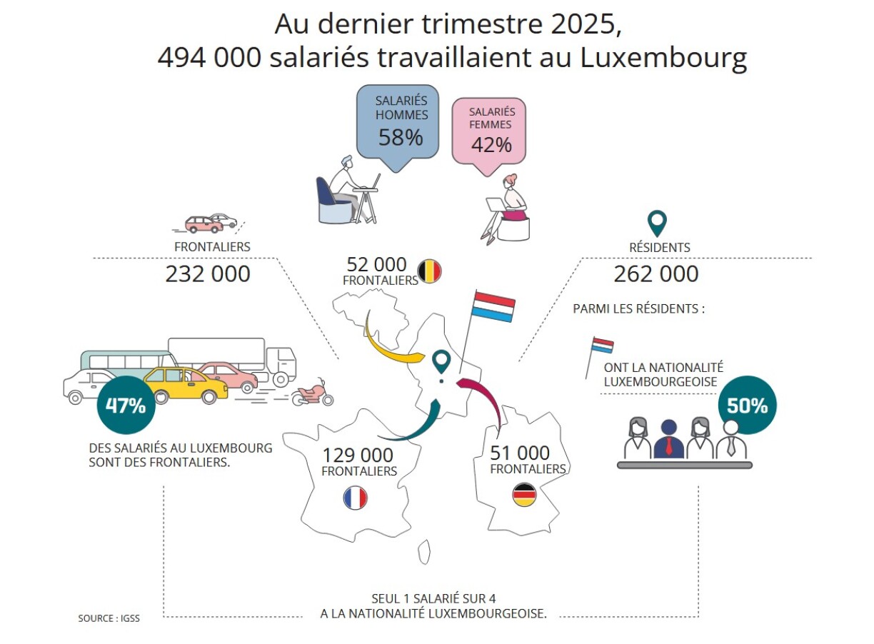 Avec 262.000 résidents pour 232.000 frontaliers, le marché du travail luxembourgeois est déjà l'un des plus atypiques d'Europe : 47% des salariés sont des frontaliers. Selon le Statec, seul un quart des 494.0000 salariés du pays ont la nationalité luxembourgeoise.