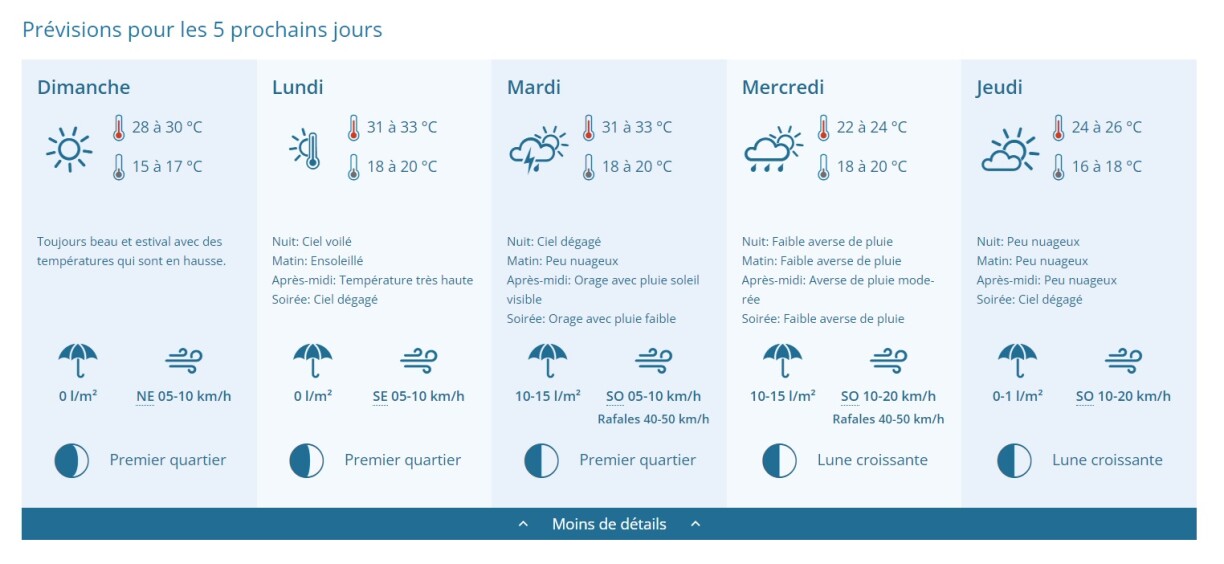 Pas de nuages au programme non plus pour le début de la semaine prochaine, la journée de lundi s'annonce très chaude avec des maximas compris entre 30 et 33 degrés.