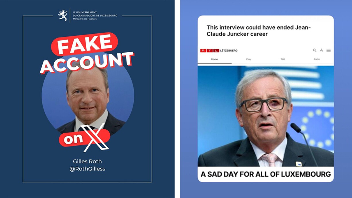 Il y a d'une part un faux compte sur "X" du ministre Gilles Roth. La fraude a d'ailleurs été signalée par le ministère des Finances. Le faux compte est notamment reconnaissable au double "s" qui figure à la fin du prénom du ministre: "@RothGilless". Le ministère recommande de ne pas répondre aux messages provenant de ce compte et de le signaler si vous en recevez un.