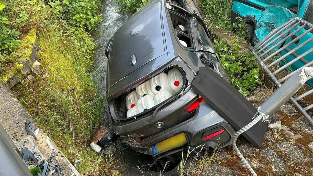 De ce fait les auteurs présumés de l'attaque du distributeur de billets ont dû emprunter dans leur fuite une rue plus étroite, mais sur quelques centaines de mètres seulement. En effet, la voiture a rapidement percuté le parapet d'un pont et s'est immobilisée au bord du cours d'eau situé en contrebas, la Mühlenbach.