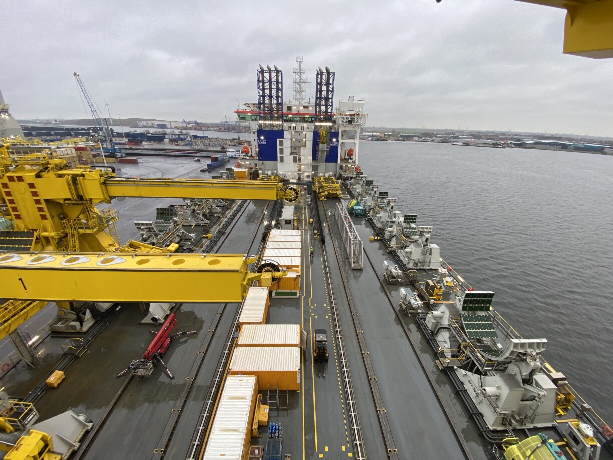 Les préparatifs pour la mission dans le nord de la Grande-Bretagne battent leur plein lors de notre visite du navire dans le port d’Amsterdam. L’équipage restera en mer jusqu’à six semaines sans retour prévu sur la terre ferme. Pour chaque pilier implanté sur le fond marin, des mois de travail préparatoire sont nécessaires, allant des analyses détaillées du sol aux contrôles et tests de toutes les machines avant le départ.