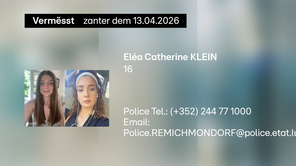 Si vous disposez d’informations concernant le lieu où se trouve la personne disparue, vous êtes prié de contacter le commissariat de police de Remich/Mondorf, par téléphone au numéro (+352) 244 77 1000 ou par mail à l’adresse Police.REMICHMONDORF@police.etat.lu