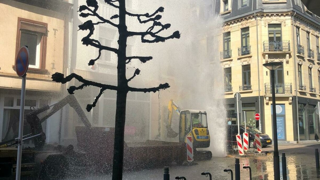 Des photos et des vidéos réalisées sur place montrent un geyser d’eau jaillir du sol depuis un chantier et atteindre une hauteur correspondant environ au deuxième étage du bâtiment voisin. Selon les premières constatations, un entrepreneur est tombé sur une conduite d’eau pendant des travaux et l’a endommagée, indique le service de presse de la mairie d’Esch-sur-Alzette.