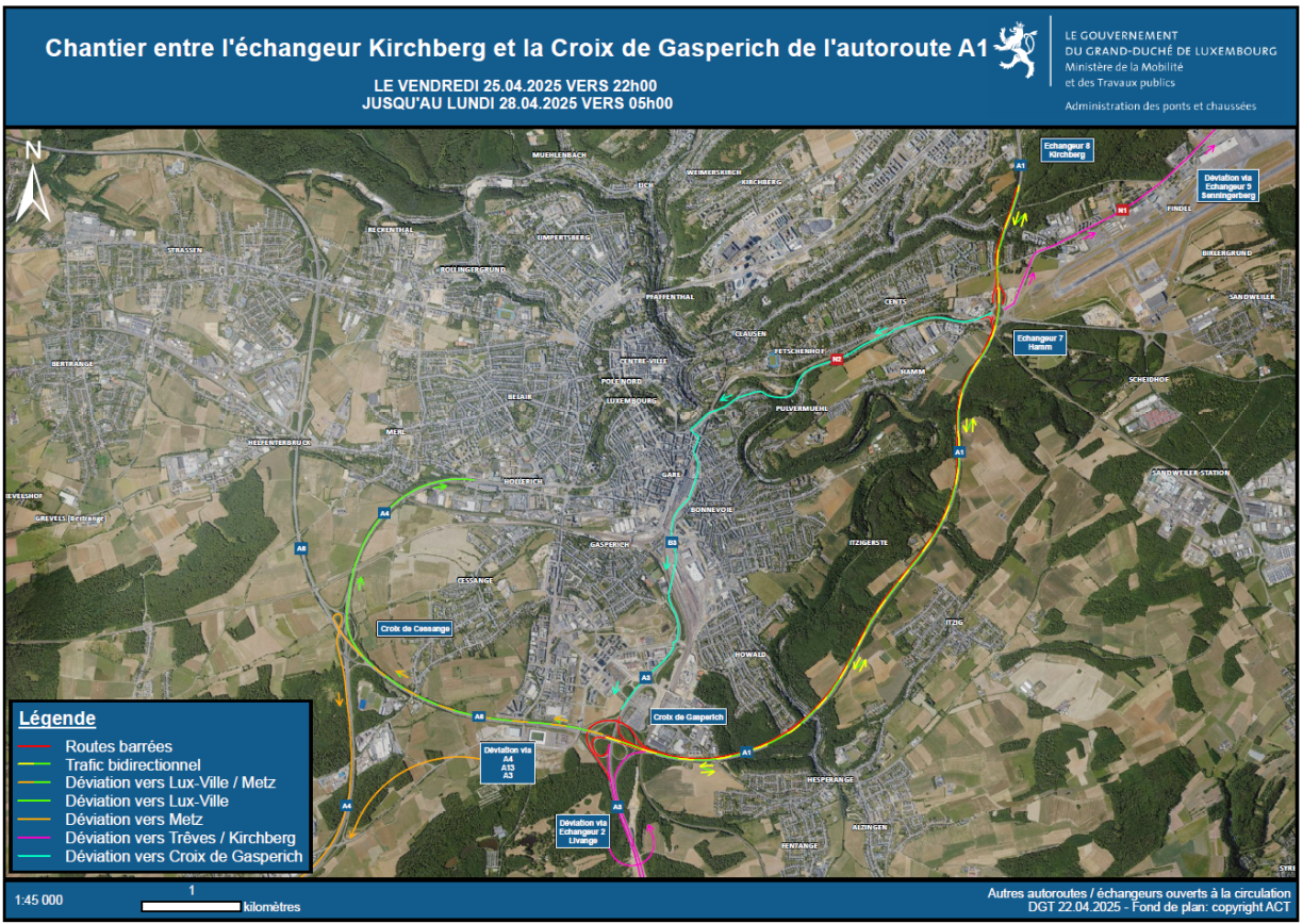 Le trafic en provenance de l’A1 exploitée en bidirectionnel vers la croix de Gasperich et en direction de l’A3 vers Metz sera dévié via la croix de Gasperich, l’A6 en direction de Belgique, la croix de Cessange, l’A4 en direction d’Esch-sur-Alzette, la jonction Esch, l’A13 en direction de Schengen et la croix de Bettembourg.