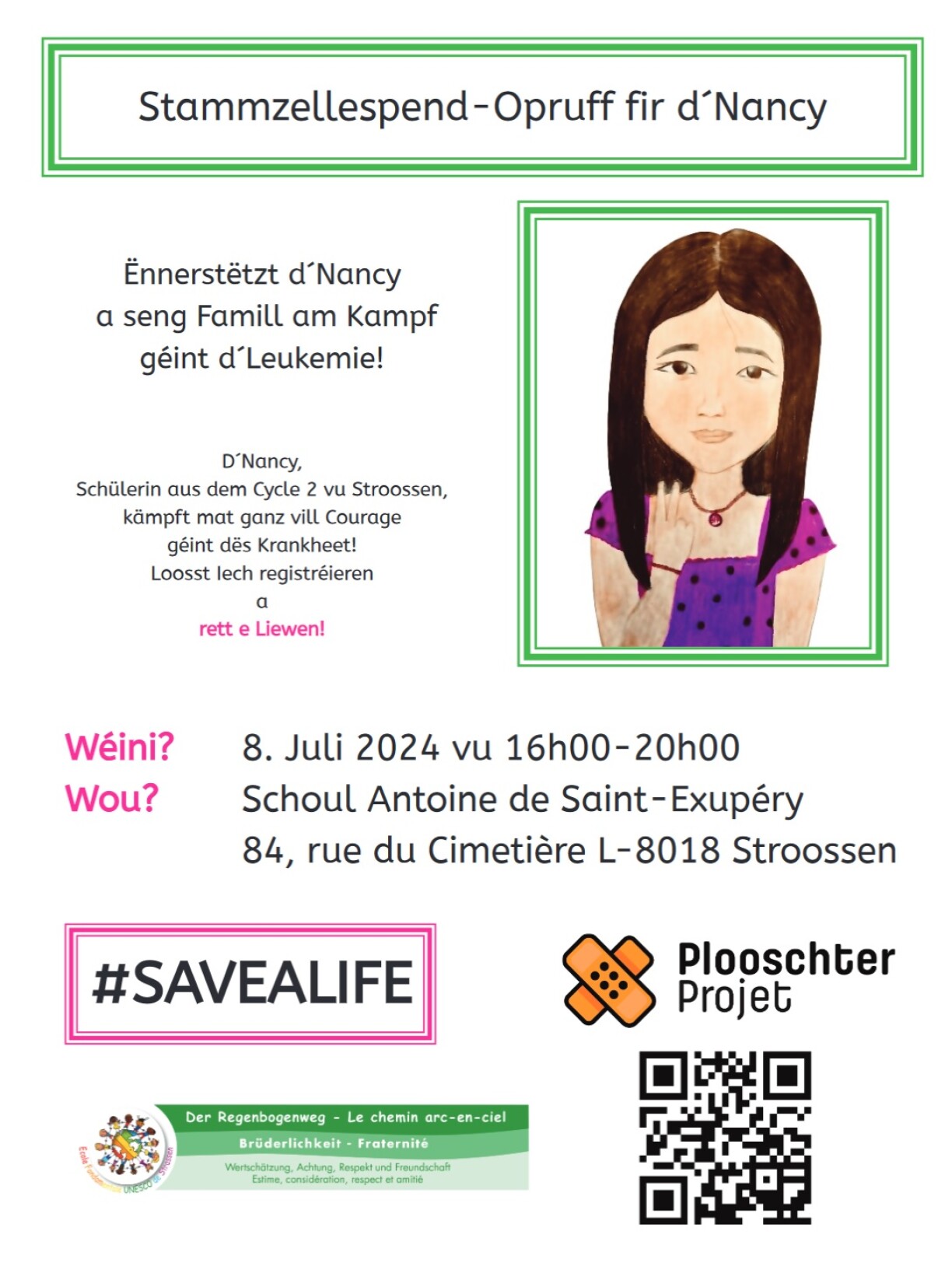 Ce lundi, les personnes souhaitant aider la jeune fille peuvent s'enregistrer à l'école primaire de Strassen en tant que donneur de cellules souches potentiel. Il s'agit d'un geste purement altruiste mais qui peut ainsi augmenter les chances de guérison.