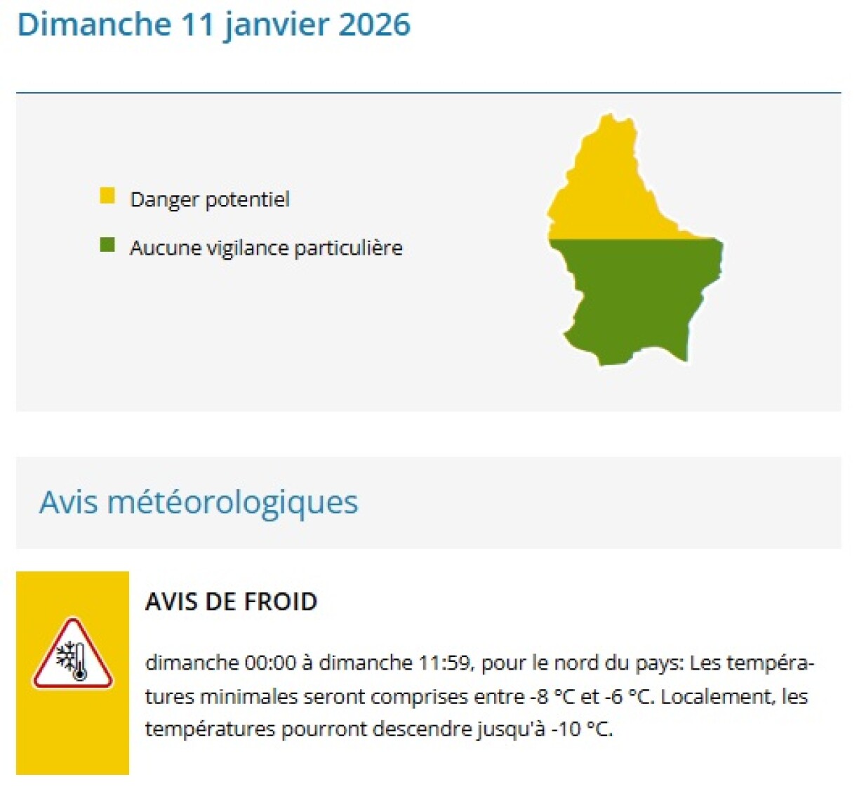 Dimanche, en revanche, sortez couverts, car le mercure va nous rappeler ce qu’est un vrai hiver au Luxembourg ! Météolux émet une alerte jaune au grand froid de minuit à midi pour la moitié nord du pays: les températures minimales seront comprises entre -8 °C et -6 °C. Localement, les températures pourront même descendre jusqu’à -10 °C. Et le soleil pourra même pointer le bout de son nez entre deux nuages. Un temps idéal pour une balade vivifiante.