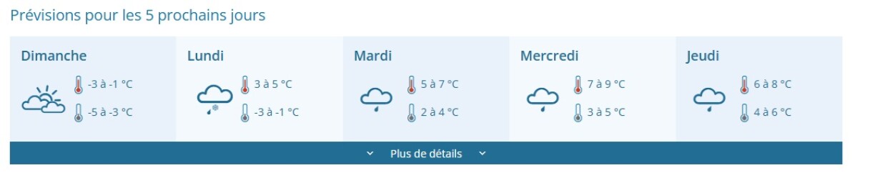 La semaine prochaine, changement d’ambiance. Quelques flocons pourront tomber lundi, avant que les températures amorcent leur remontée. Jusqu’à 5°C lundi, 7°C mardi, et 9°C mercredi, et aucune température négative le matin dès mardi. Hélas, le ciel restera maussade, avec des pluies éparses et des nuages. Attention aussi à des rafales de vent qui pourraient traverser le pays mercredi, jusqu’à 50 km/h.