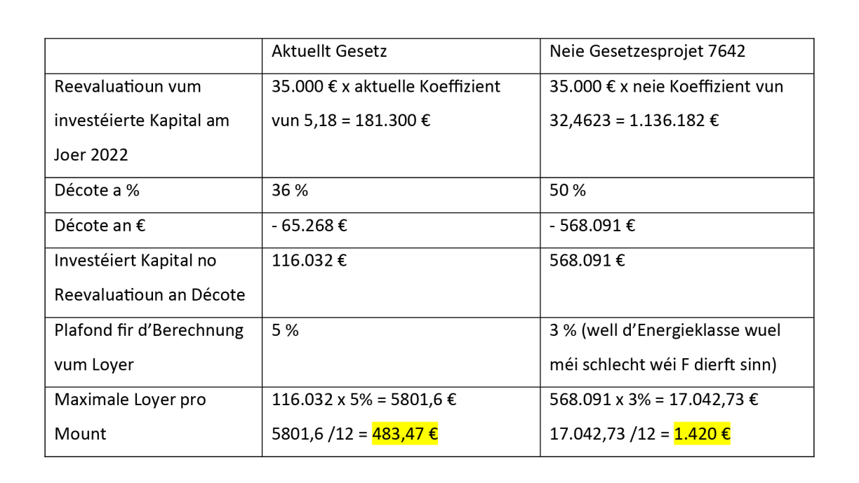 Voici plusieurs exemples pour comparer. Dans le capital investi, qui a été choisi ici, les frais qui surviennent lors d’un achat, sont inclus afin de garder les exemples clairs. Il n’est volontairement fait mention d’aucun mètre carré, car ceux-ci ne jouent aucun rôle, ni dans le texte actuel ni dans le nouveau, pour le calcul du loyer. Pour ces exemples, RTL a eu recours à la calculatrice du ministère du Logement. Vous la trouverez ici et ici: