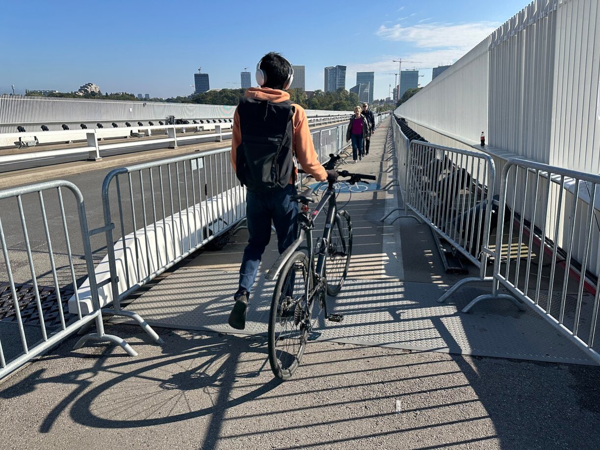De plus, les cyclistes sont contraints de pousser leur vélo sur toute la longueur du pont (355 mètres). Cela est particulièrement irréalisable pour les familles avec des vélos cargo transportant des enfants et des bagages. De sorte que le risque de devoir circuler sur la chaussée peut s’avérer dangereux.