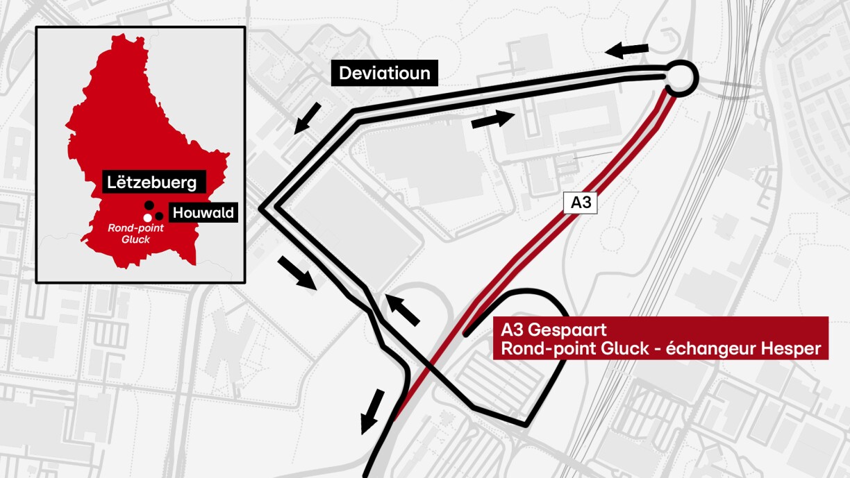 Le trafic en provenance de l'autoroute A3 et en direction de Luxembourg-Ville sera dévié à partir de l'échangeur Hesperange via le CR231 (boulevard F.W. Raiffeisen) et la N4A (boulevard de Kockelscheuer).