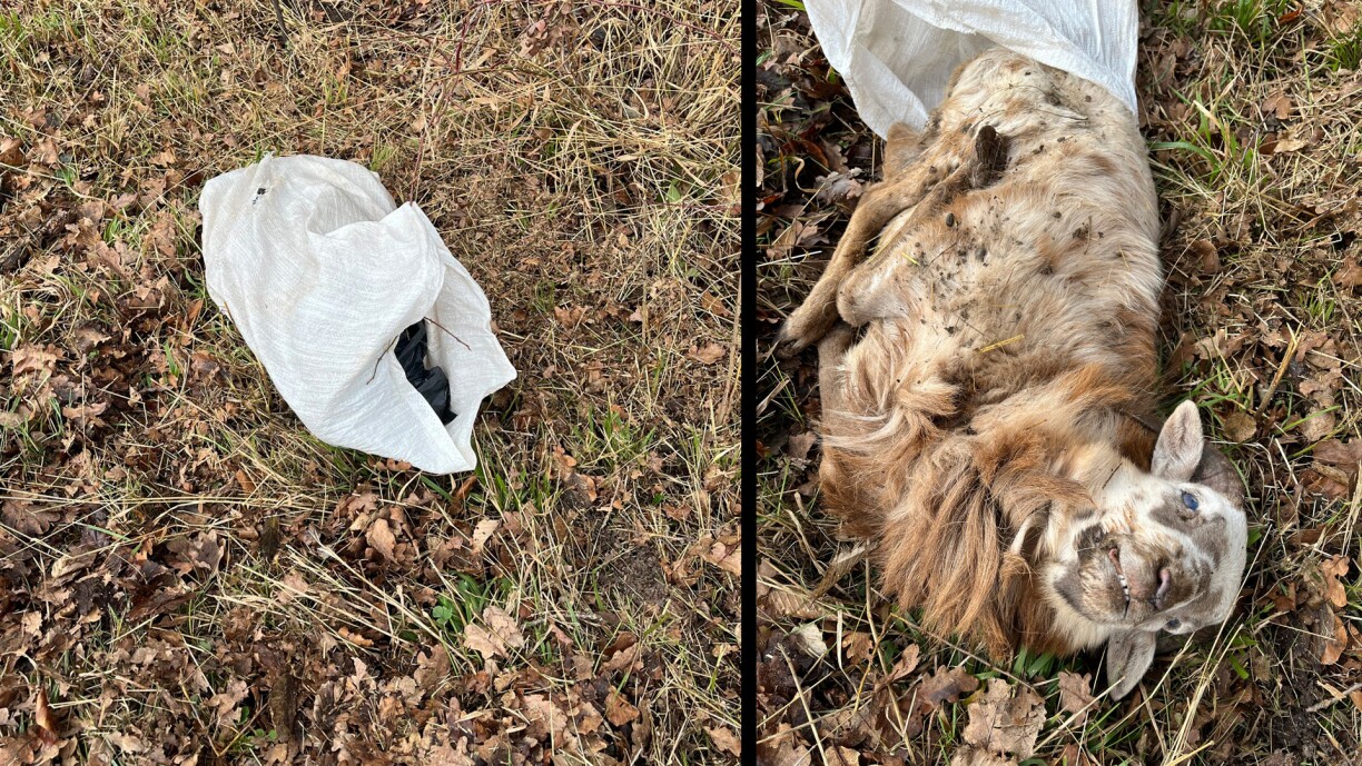 Quelqu'un s'est visiblement débarrassé d'un cadavre de mouton emballé dans un sac plastique sur ce chemin.