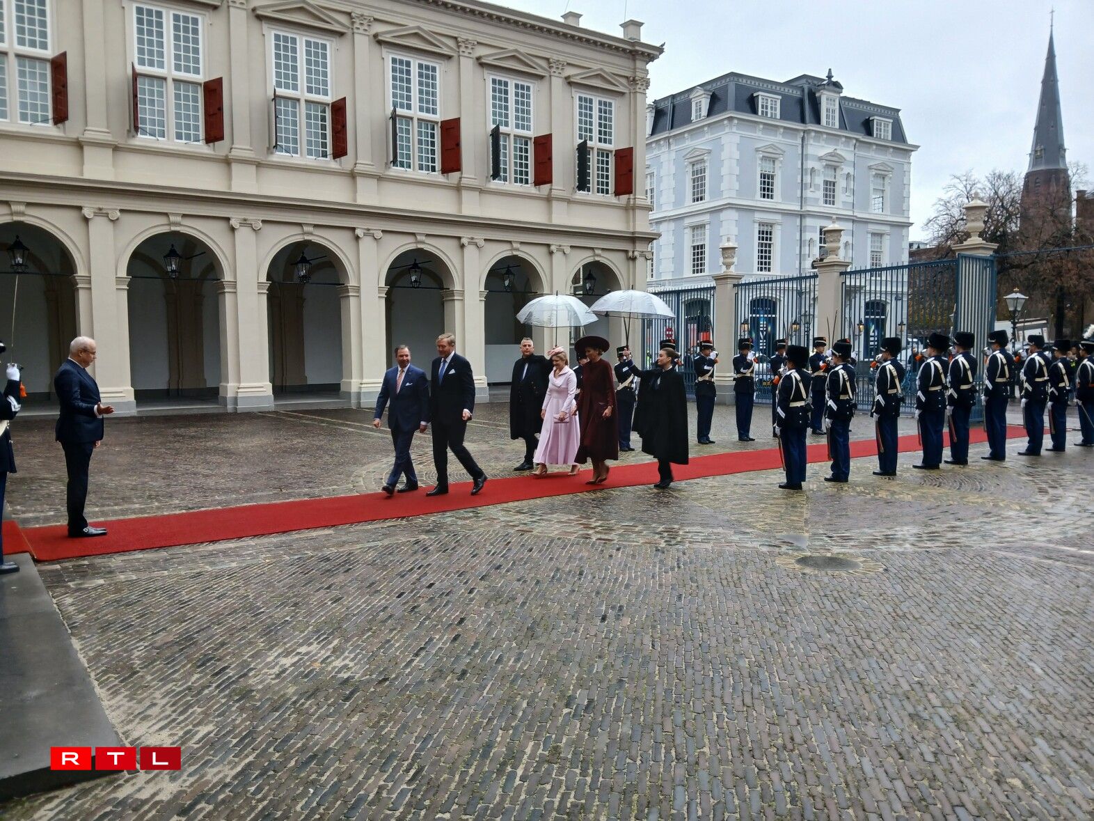 Le dernier point à l’ordre du jour était une nouvelle entrevue avec le couple royal, cette fois au palais Noordeinde, en présence de la Grande-Duchesse. La réception a débuté par un passage sur le tapis rouge devant la haie d’honneur et s’est achevée par un déjeuner. Les hymnes nationaux n’ont pas retenti, car ce n’est pas prévu aux Pays-Bas lors d’une visite de courtoisie.