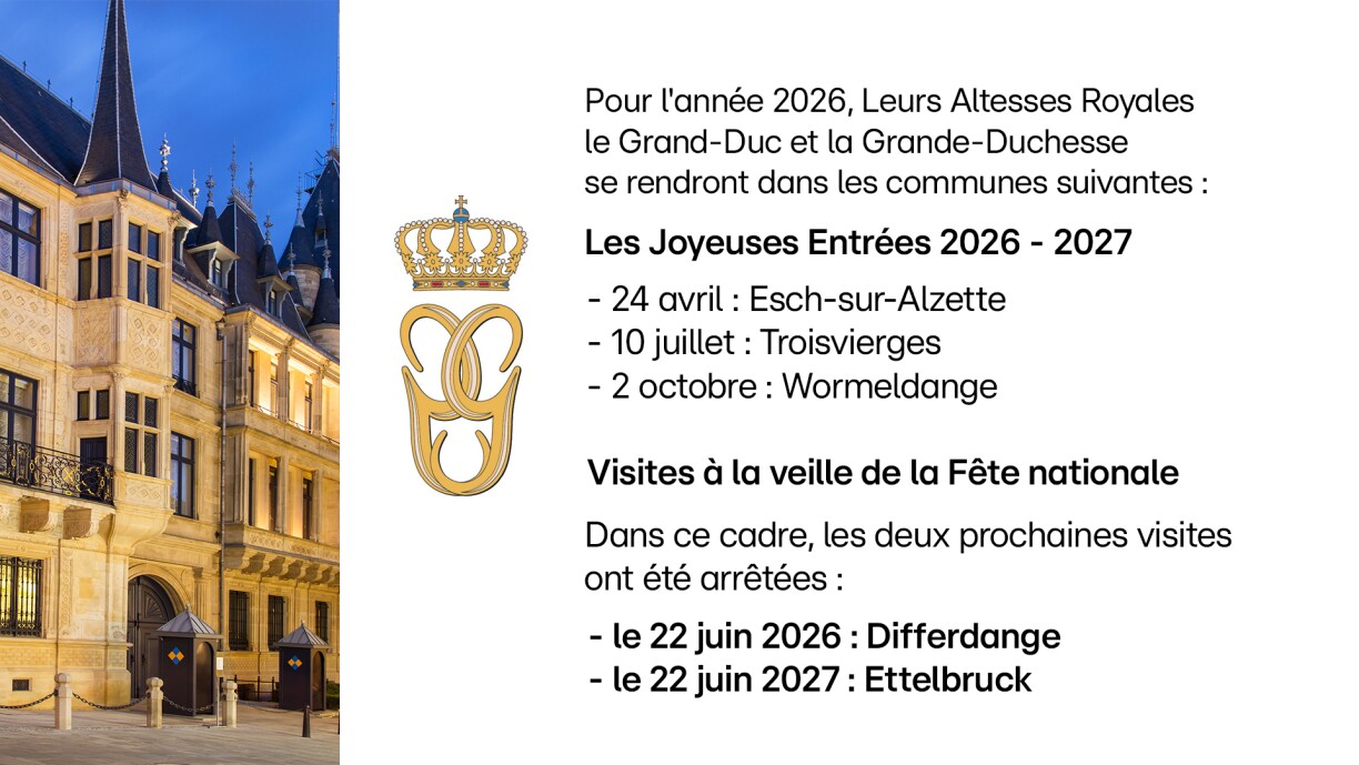 Dans le cadre de la Fête nationale, le couple grand‑ducal visitera cette année Differdange le 22 juin, avant de se rendre comme chaque année en soirée à Luxembourg‑Ville pour la traditionnelle procession aux flambeaux. En 2027, c’est la commune d’Ettelbruck qui accueillera le Grand-Duc Guillaume et son épouse la veille de la Fête nationale.