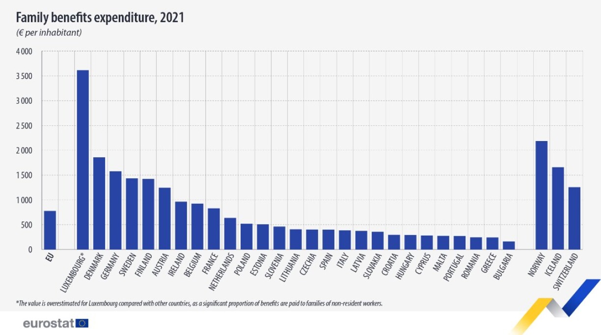 Et le Luxembourg est de loin le champion d'Europe des dépenses en matière de prestations familiales. Le pays a investi 3.611 € par personne en 2021, dernière année disponible dans le classement d'Eurostat, l'office statistique de l'Union européenne. Songez que c'est 4,6 fois la moyenne européenne et presque 15 fois plus qu'en Roumanie!