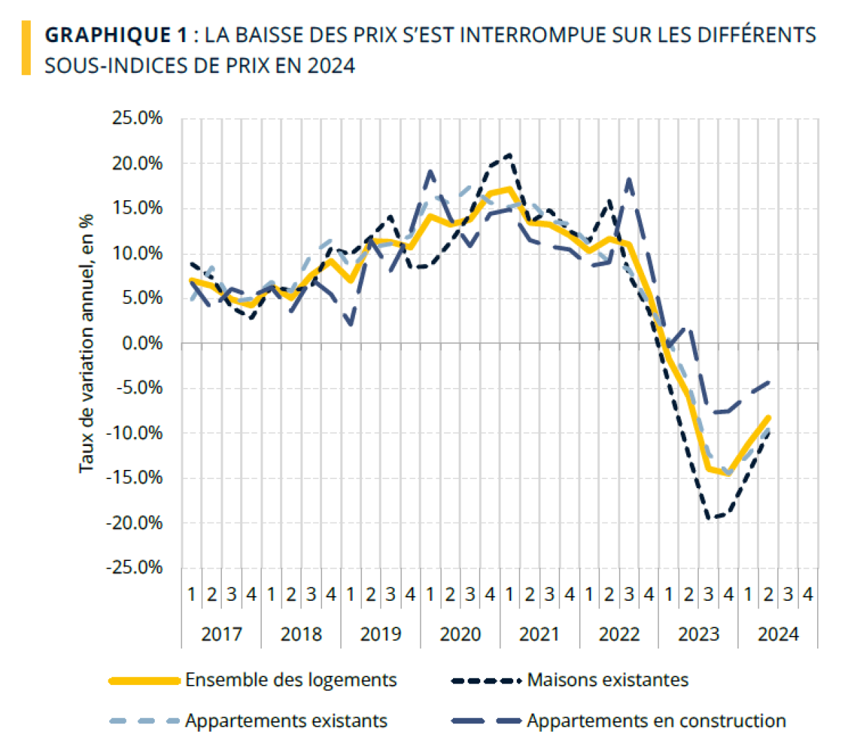 Le ralentissement de la baisse des prix des logements se confirme ce trimestre. Les prix des logements restent en baisse sur douze mois: -8,3% entre le 2e trimestre 2023 et le 2e trimestre 2024, soit :