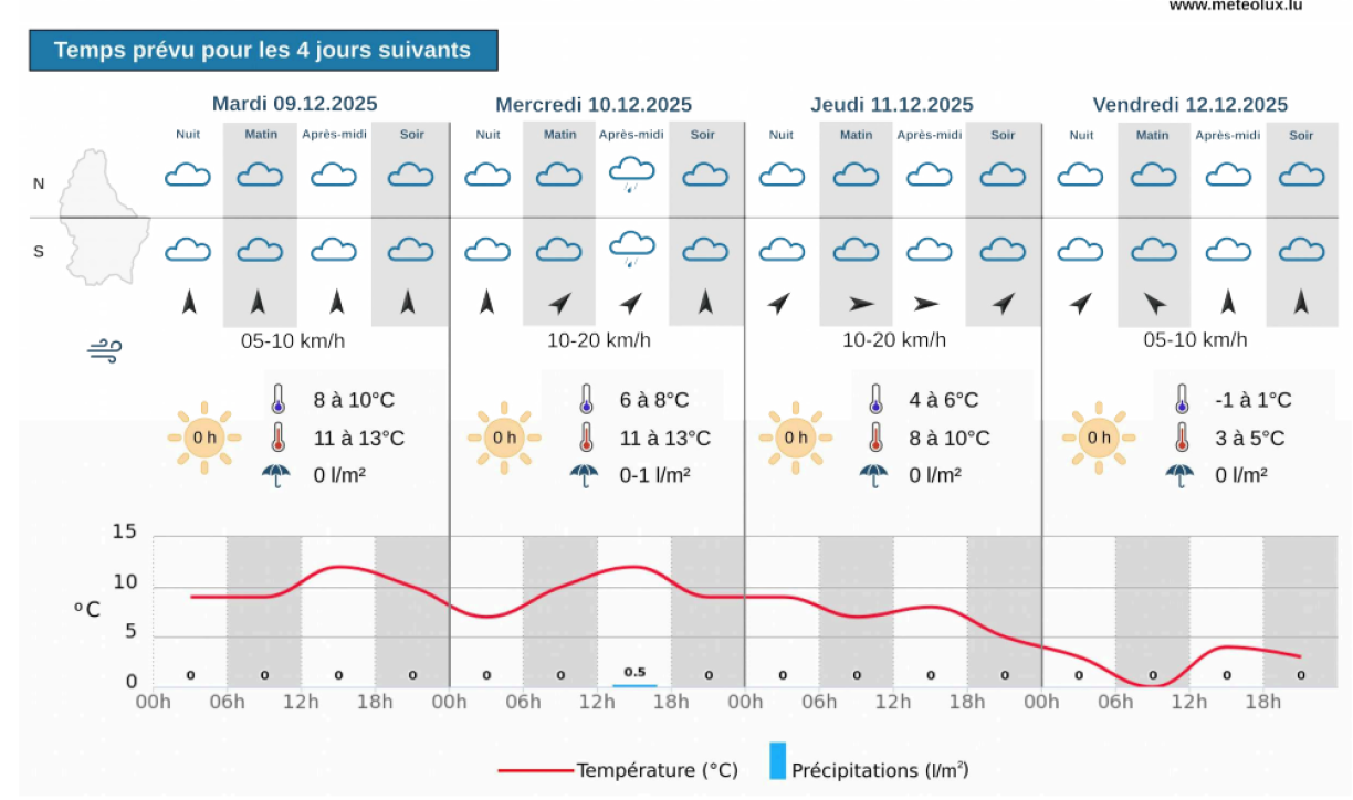 Mardi et mercredi seront les deux journées “les plus chaudes” de cette semaine douce en températures, puisque Meteolux prévoit que le mercure monte jusqu’à 13°C. Malgré un temps couvert. Les nuits, jusqu’à jeudi compris, les températures resteront nettement au-dessus de zéro. Jusqu’à 10°C mardi et jusqu’à 8°C mercredi.