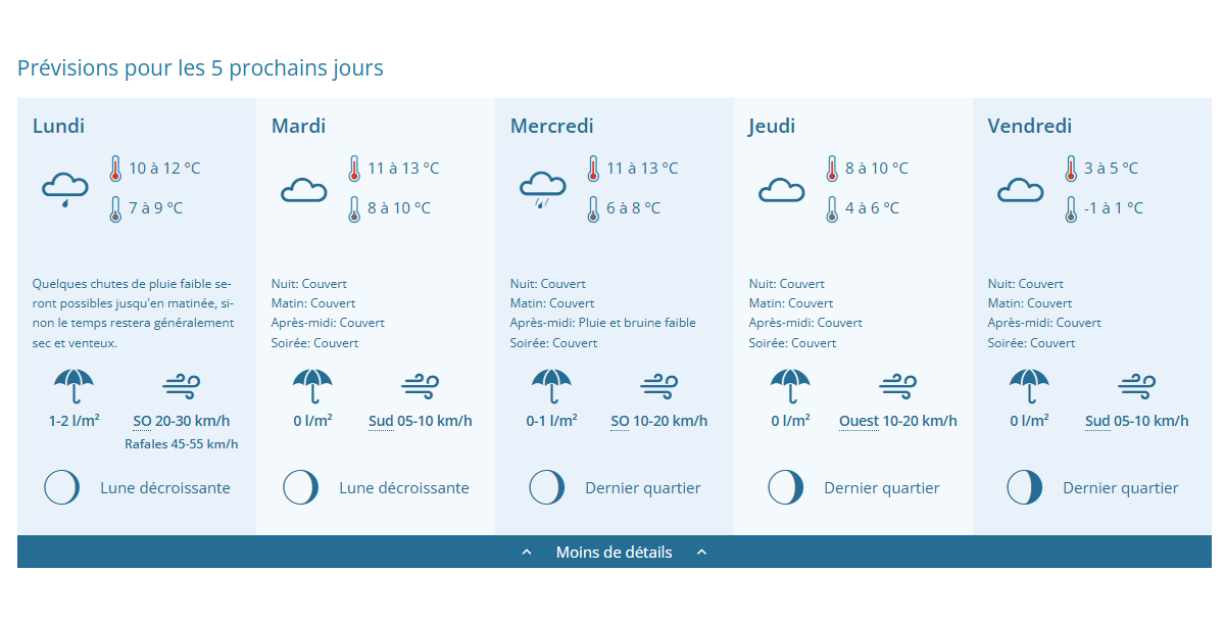 Les températures remonteront pendant la nuit et atteindront de 7°C à 9°C au petit matin de lundi. Demain, en journée, les températures seront plutôt douces pour la saison, puisqu’elles oscilleront entre 10 et 12 °C. Le vent soufflera bien ce lundi. Des rafales atteignant 45 à 55 km/h sont annoncées par le site météorologique officiel du gouvernement.