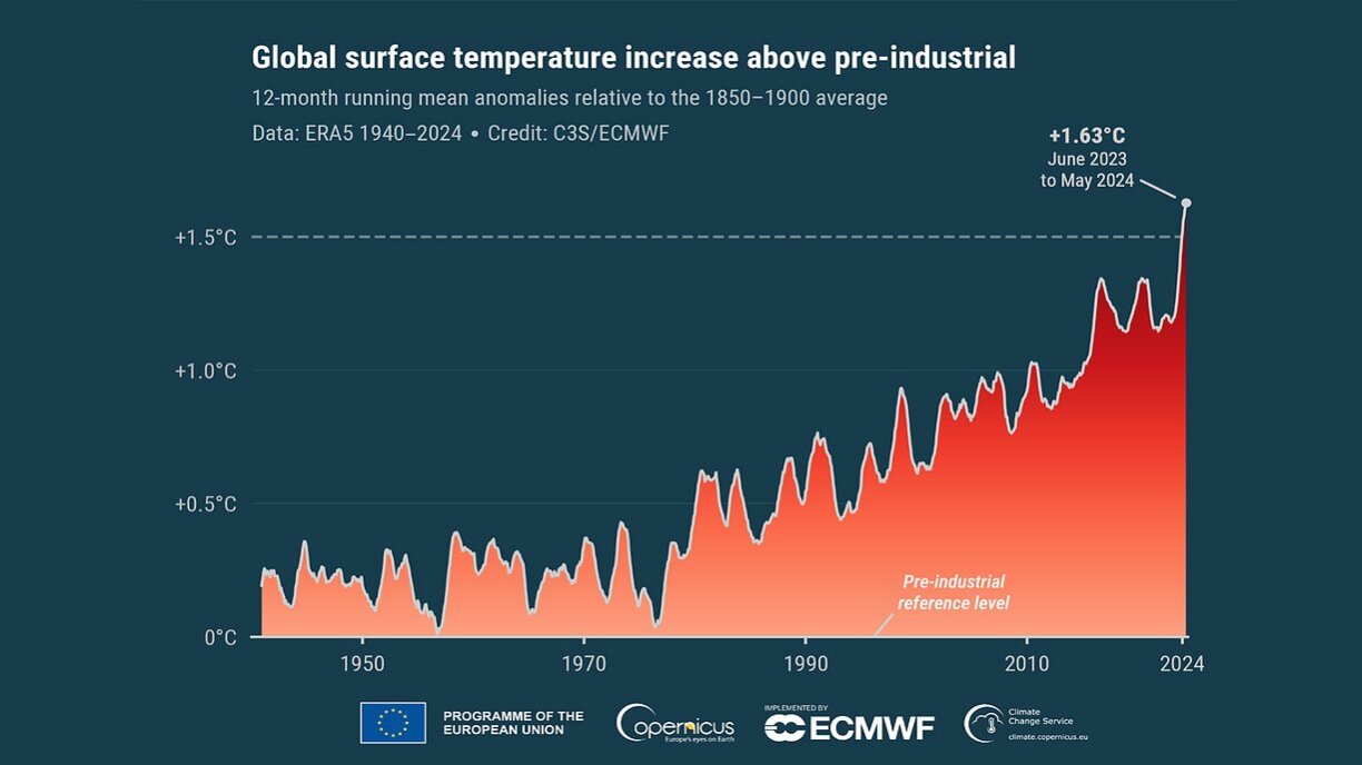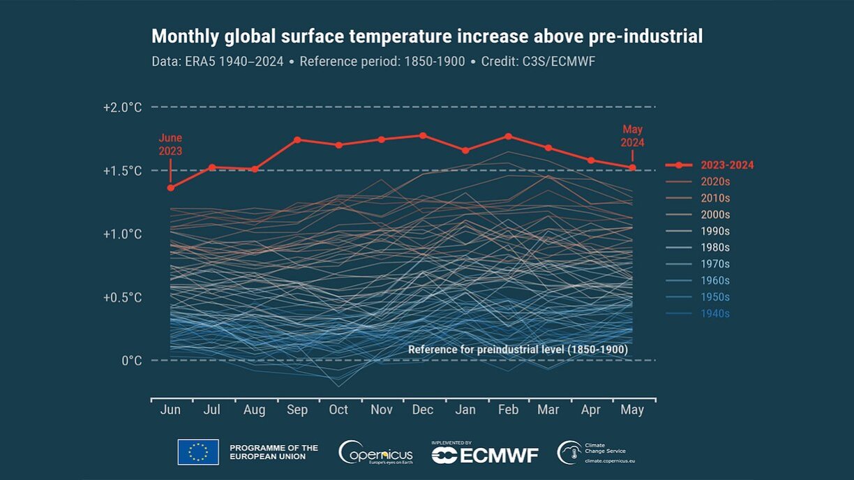Concrètement, les chiffres de l'Observatoire européen du climat montrent que la température moyenne en mai 2024 était de 1,52°C supérieure à la moyenne préindustrielle de 1850 à 1900. Ce qui en fait le 11e mois consécutif (depuis juillet 2023) avec plus de 1,5°C de plus. La température moyenne mondiale des 12 derniers mois (juin 2023 à mai 2024) est la plus élevée depuis le début des relevés.