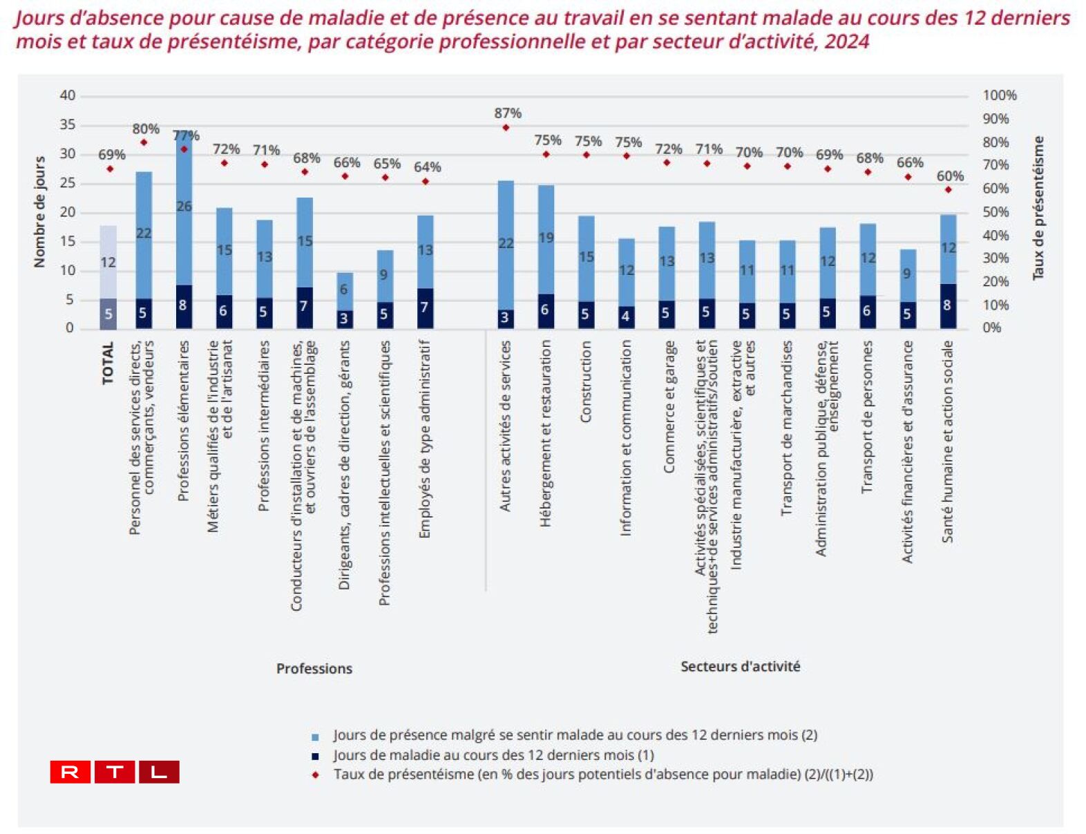 Le fait d’être “en bas de l’échelle” jouerait également un rôle si l’on se fie à l’enquête “QoW 2024". En effet, chez les dirigeants, les cadres de direction et les gérants, le taux de présentéisme tombe à 9 jours par an. “Ce phénomène touche particulièrement les salariés exerçant des professions plus exposées à des conditions de travail difficiles”, confirme la Chambre des salariés dans un communiqué envoyé à la presse jeudi. La crainte de perdre son emploi ou d’être pénalisé seraient des facteurs déterminants pour inciter les salariés malades à aller travailler.