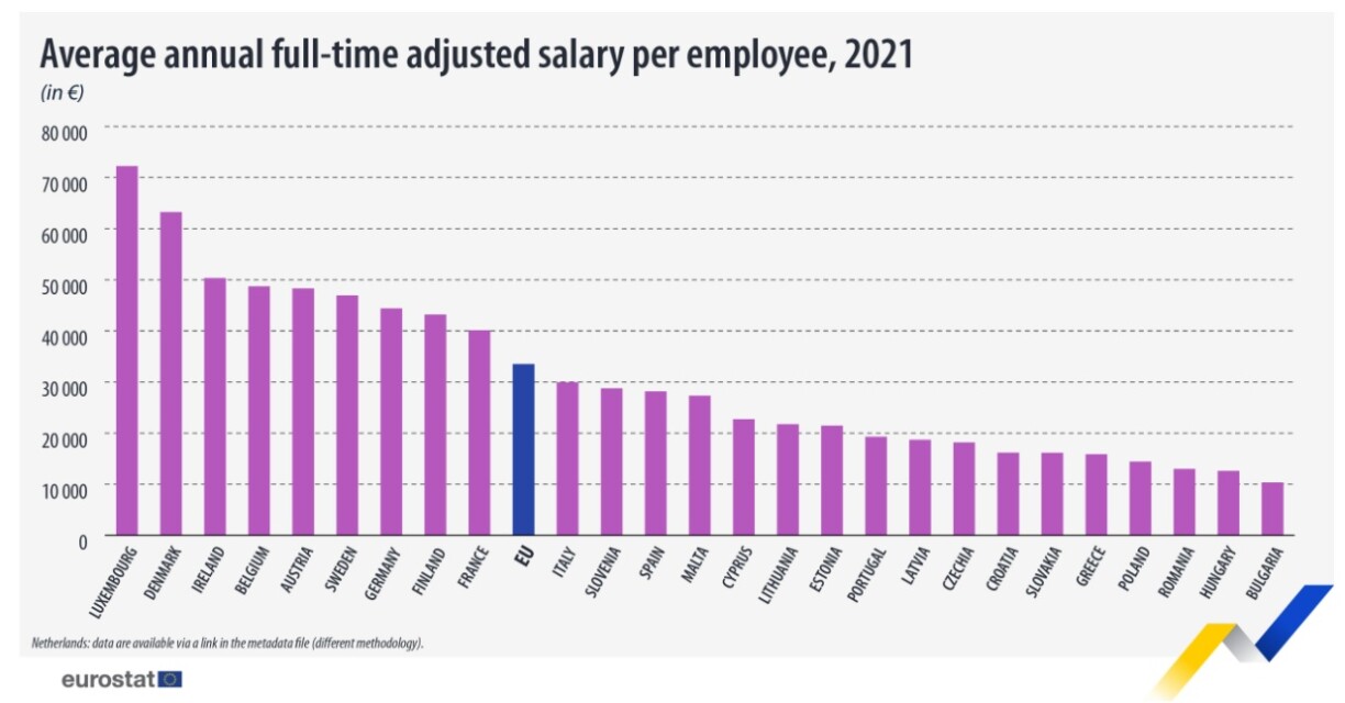La moyenne européenne est à 33.500€ par an, tandis que le Portugal est dans la fourchette basse avec environ 19.300€ de salaire par an.