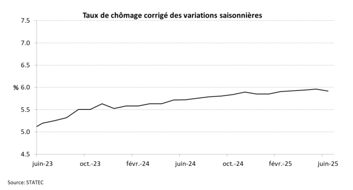 Le taux de chômage a légèrement baissé en juin, pour atteindre 5,9 % contre 6% un mois auparavant. En valeur absolue, l’adem a enregistré 17.886 demandeurs d’emploi au 30 juin 2025, contre 18.469 à la fin mai. Ce qui signifie que 583 personnes de moins sont inscrites à l’adem.