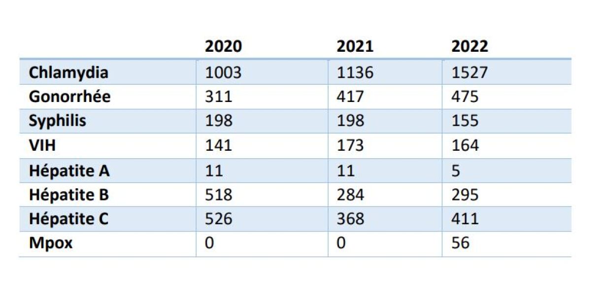 La hausse la plus significative est celle des cas de chlamydia qui sont passés de 1.003 en 2020 à 1.527 en 2022 soit, une hausse de plus de 50% en deux ans. Les cas de gonorrhée, d'hépatite B, d'hépatite C et de Mpox étaient également à la hausse sur la même période.