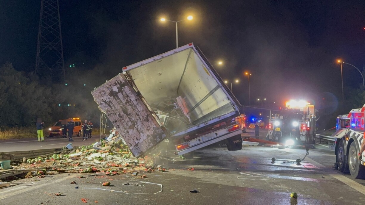 Un camion s’est renversé et a terminé sa course sur la glissière de sécurité, provoquant également la chute d’un poteau sur la voie opposée.