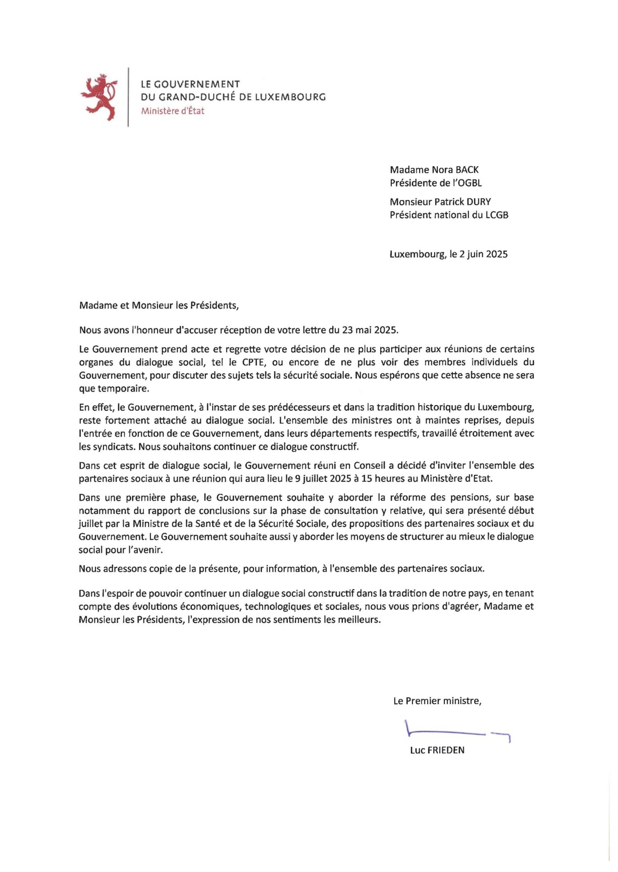 Fin mai, les deux syndicats ont adressé une lettre au Premier ministre, Luc Frieden, annonçant qu’ils ne participeront plus à aucune rencontre jusqu’à nouvel ordre, sauf si c’est sous la forme d’une tripartite, où syndicats, employeurs et gouvernement se réunissent dans un cadre institutionnalisé. La réponse du Premier ministre se faisait attendre, elle vient juste de leur parvenir.