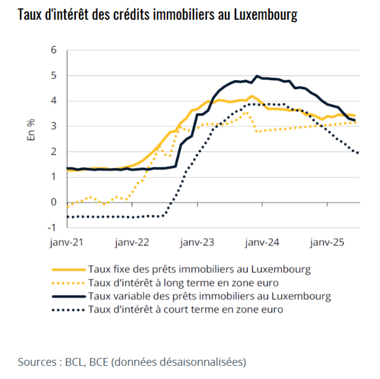 Le taux d’intérêt variable moyen est redescendu légèrement en-dessous du taux fixe depuis mai et devrait continuer de baisser, selon le Statec. Le taux fixe va en revanche se stabiliser autour de 3,4%.