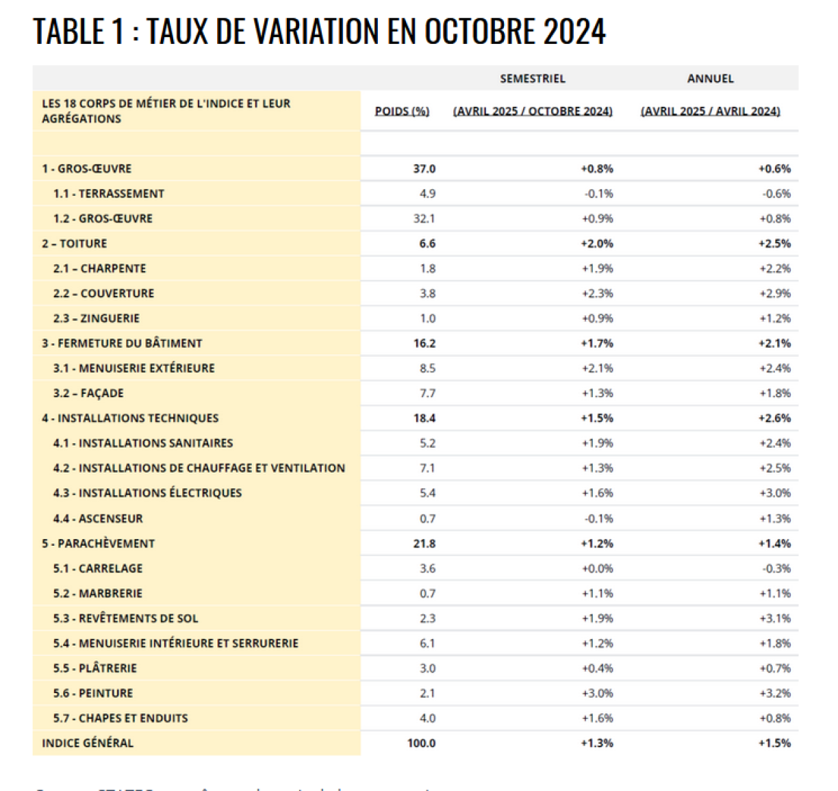 - Du côté de la fermeture du bâtiment, qui comprend les fenêtres avec les dispositifs de protection solaire, les portes de garages et les façades, on constate une progression des prix de 1.7% entre octobre 2024 et avril 2025. Les maîtres d’ouvrage doivent débourser 2.1% de plus pour la menuiserie extérieure d’une construction résidentielle et 1.3% de plus pour les travaux de façade.