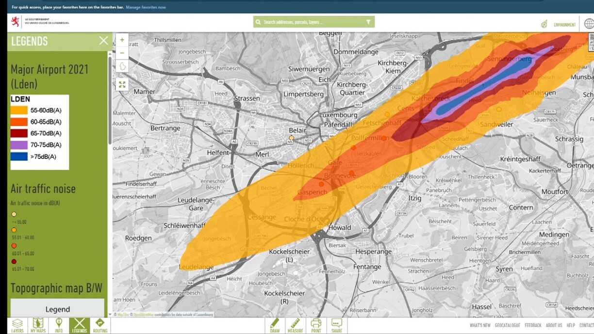 Sur les cartes de bruit de l'Administration de l'Environnement, vous pouvez voir précisément quels secteurs de la zone aéroportuaire sont impactés par le bruit et quel est leur niveau d'exposition. Certaines cartes permettent une visualisation de nuit ou de jour, L'année dernière, des mesures réelles ont été effectuées à 10 endroits différents de la zone aéroportuaire. Comme vous pouvez le voir sur Geoportail, les valeurs suivantes ont été mesurées en décibels Lden (pour day evening night, il s'agit de l'indicateur du niveau sonore moyen pour une journée entière de 24 heures): 65 décibels à Hamm, 62,2 à Bonnevoie, 61,3 à Gasperich, 56,4 au Cents et 56,5 à Roodt-sur-Syr.