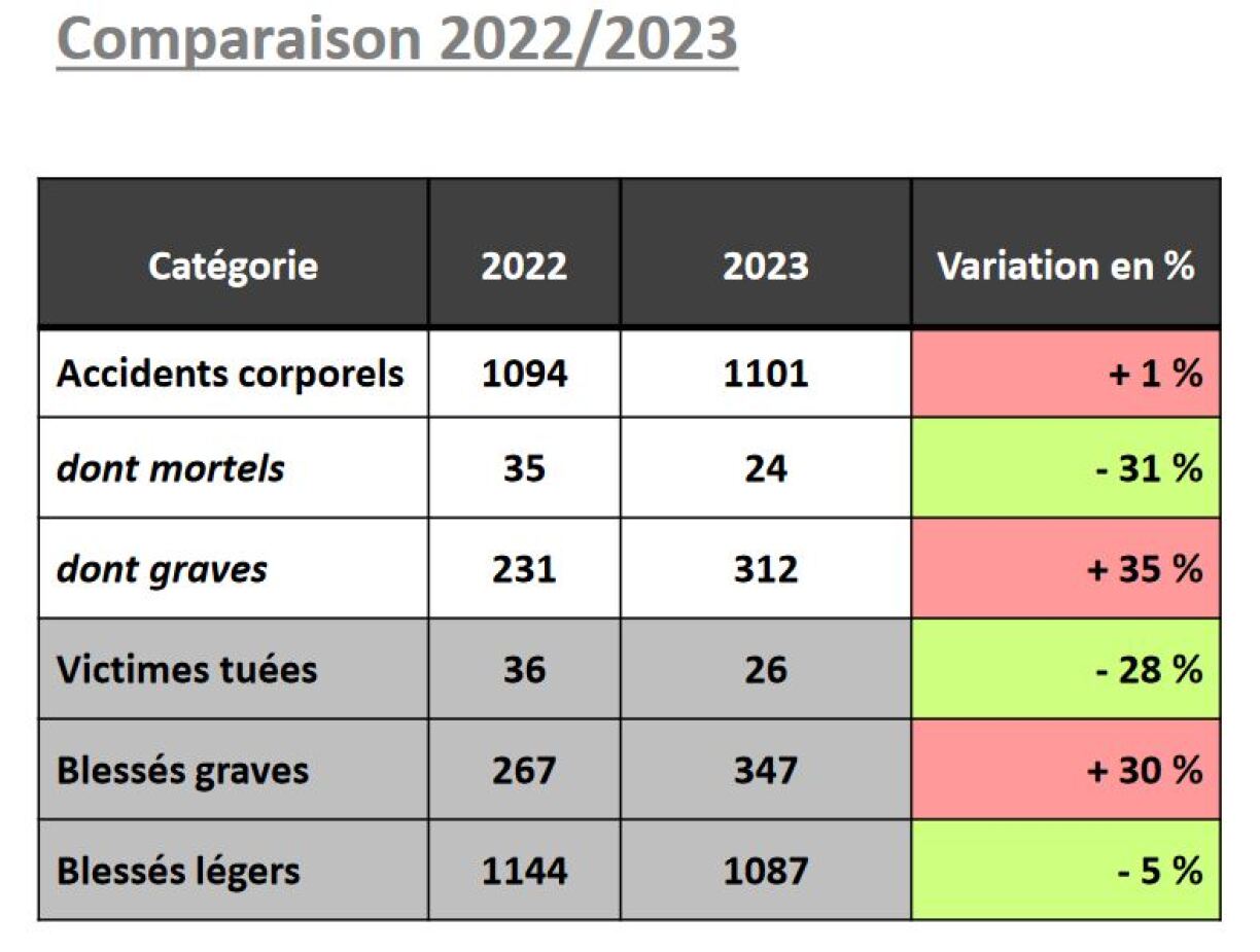 La cause la plus fréquente des accidents de la route reste la vitesse. 22% des accidents avec blessés graves et 42% des accidents mortels survenus en 2023, étaient dus à une vitesse excessive ou inappropriée. Par ailleurs, la conduite sous l'influence de l'alcool était à l'origine de 8 accidents mortels et de 39 accidents avec blessés graves en 2023.