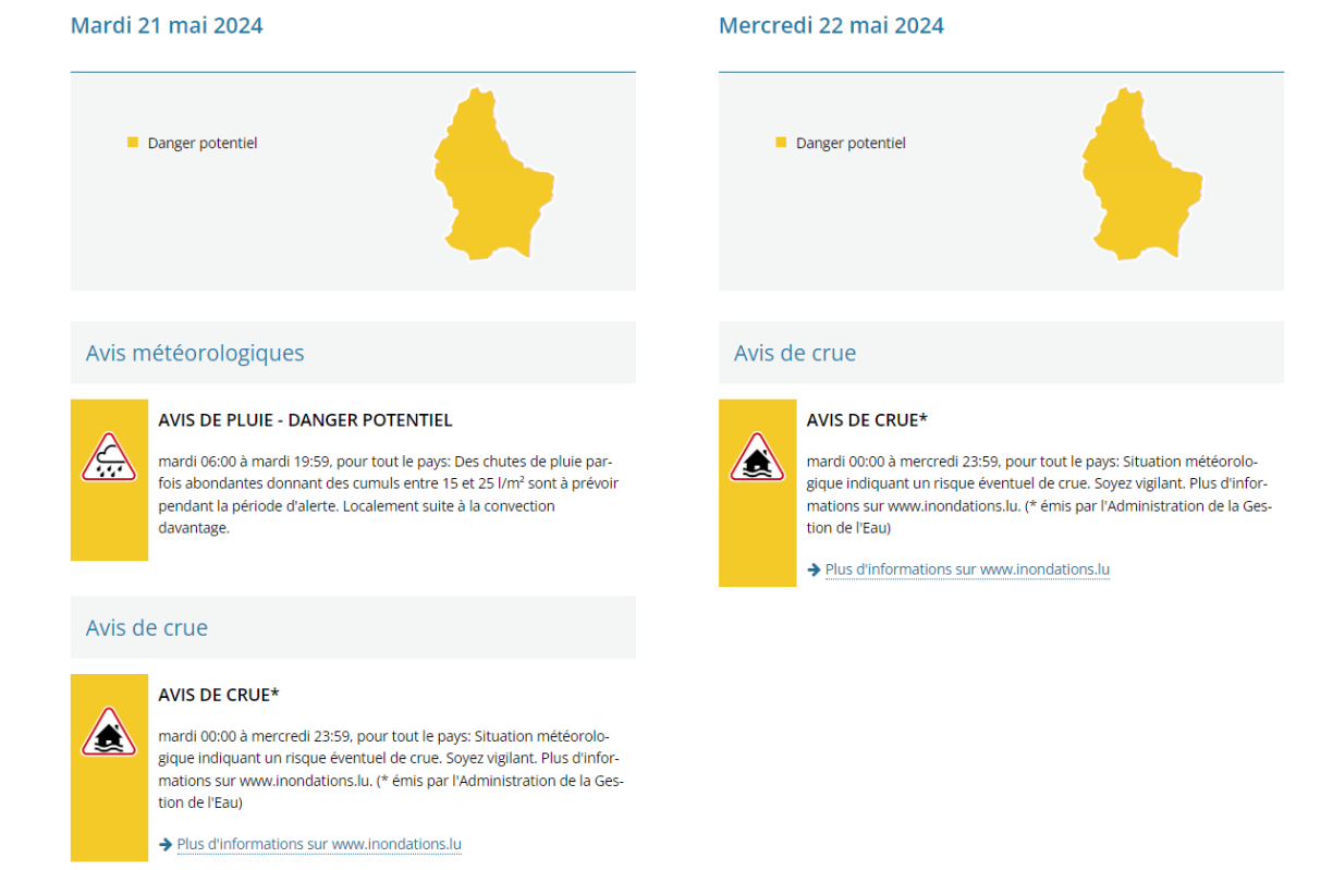 Une vigilance jaune pour risque éventuel de crue valait également depuis minuit et jusqu'à mercredi minuit pour l'ensemble du pays. Cependant, Météolux s'est ravisé dans le courant de l'après-midi et a levé l'alerte valable pour mercredi. Elle s'achève donc cette nuit à minuit.