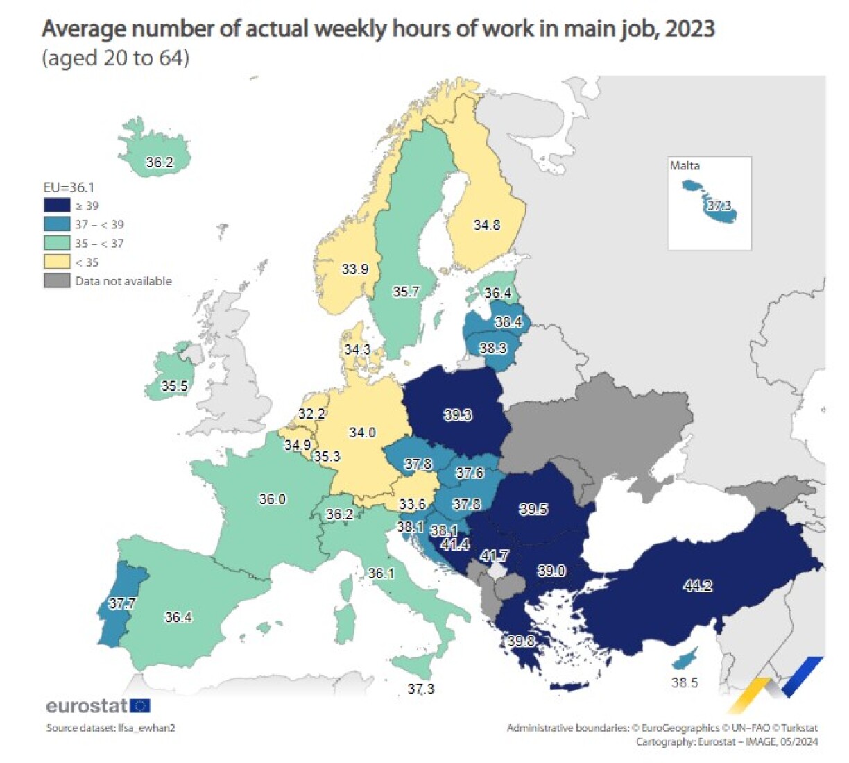 Les nouvelles données d'Eurostat, l'office statistique officiel de l'Union européenne, montrent que la durée moyenne du travail en Europe varie considérablement d'un pays à l'autre. En 2023, la durée hebdomadaire effective de travail des personnes âgées de 20 à 64 ans exerçant leur emploi principal, dans l'UE, était de 36,1 heures.