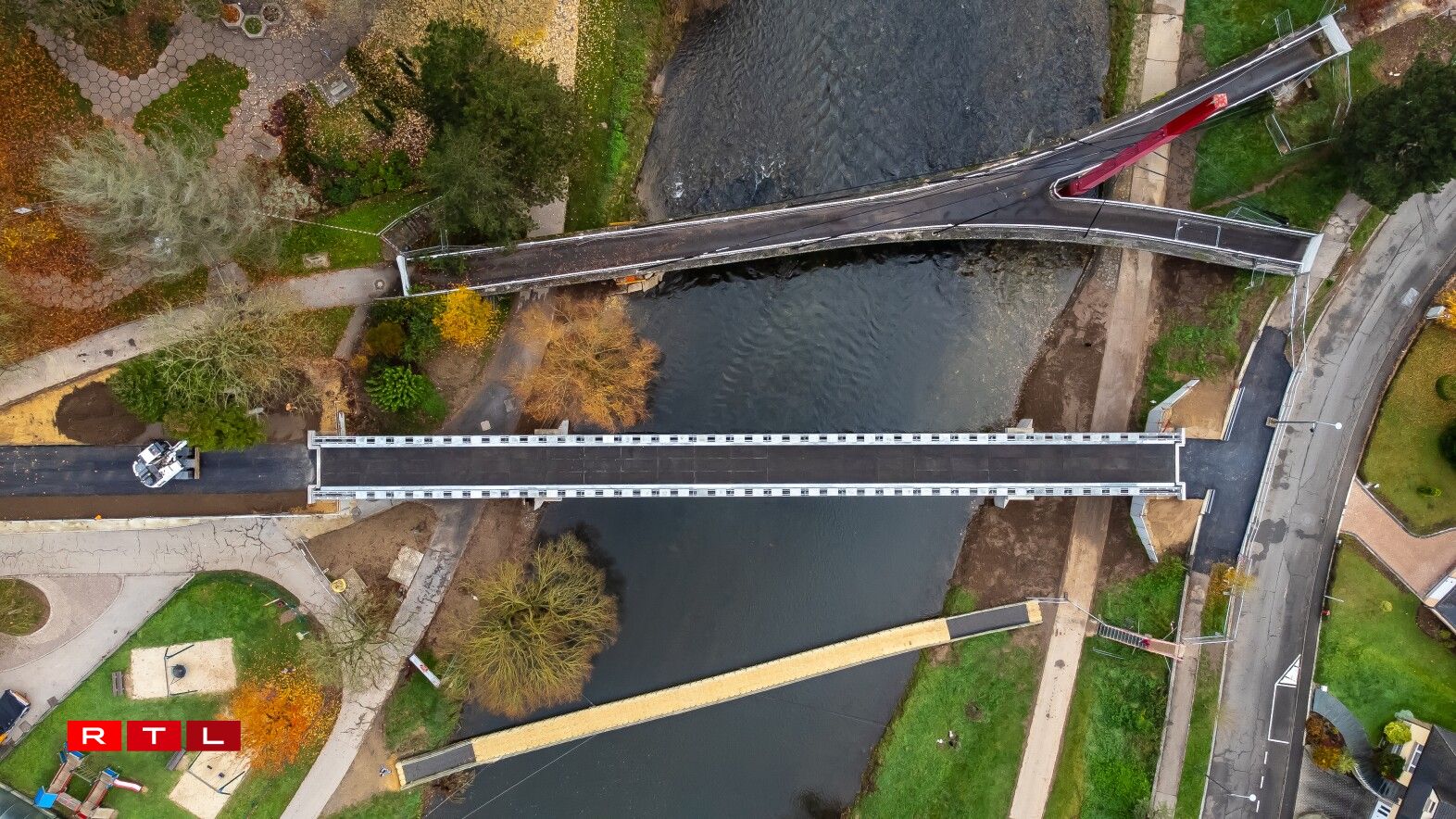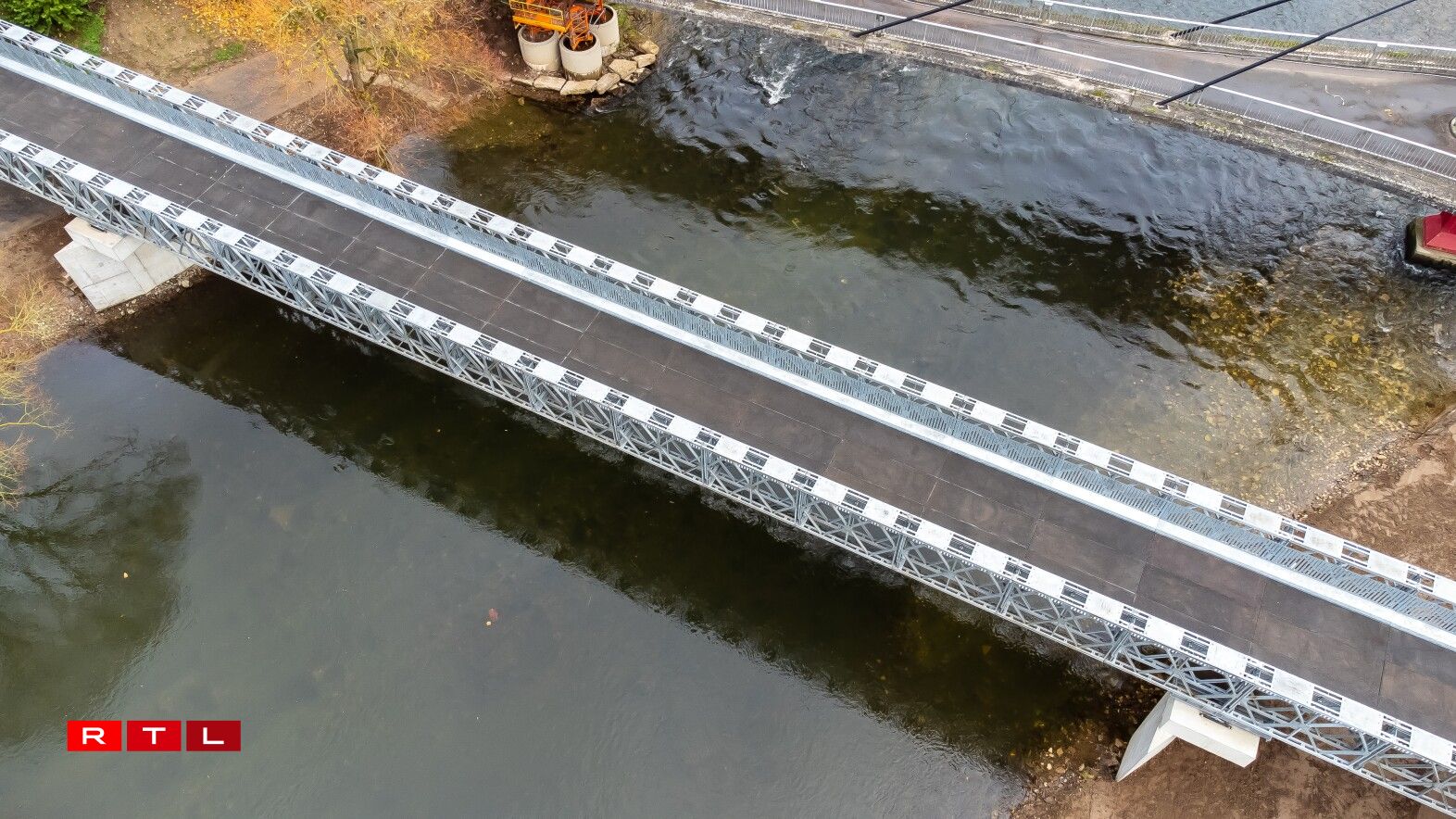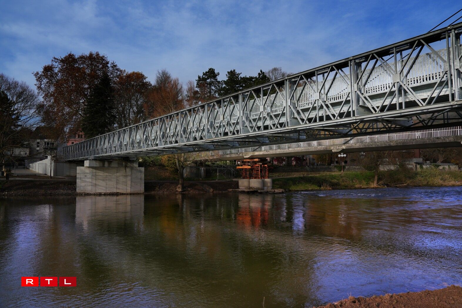 C’est sans doute une situation unique en son genre à Diekirch : trois ponts côte à côte. Pour autant, cette configuration ne durera pas. Le petit ponton va bientôt disparaître et il ne restera donc que la nouvelle passerelle provisoire, accessible dès ce lundi, pendant la fermeture du pont “ficelles”. Avec ses 70 mètres de long, c’est le plus long pont provisoire jamais installé au Luxembourg. D’une largeur de 3,5 mètres, il est doté d’une portée de 40 mètres.