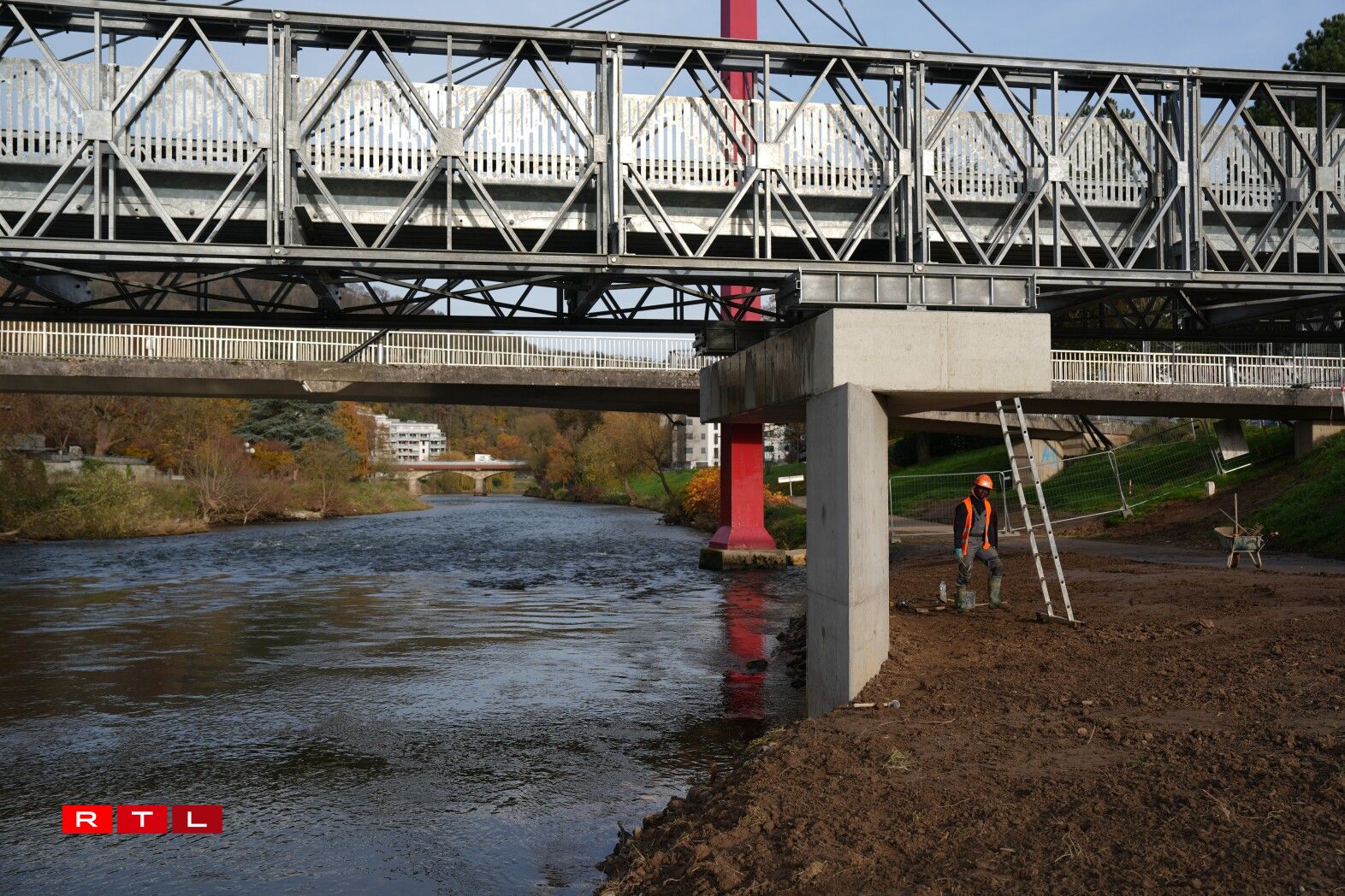 Faute de place pour assembler entièrement la structure et la poser à l’aide d’une grue, elle a été assemblée morceau par morceau sur une rive de la Sûre, puis poussée pour être mise en place. Si sa mise en service a pris un an et demi, c’est surtout parce qu’elle se situe en zone inondable, explique Fritz de Oliveira, chef des ouvrages d’art à l’administration des Ponts et Chaussées: