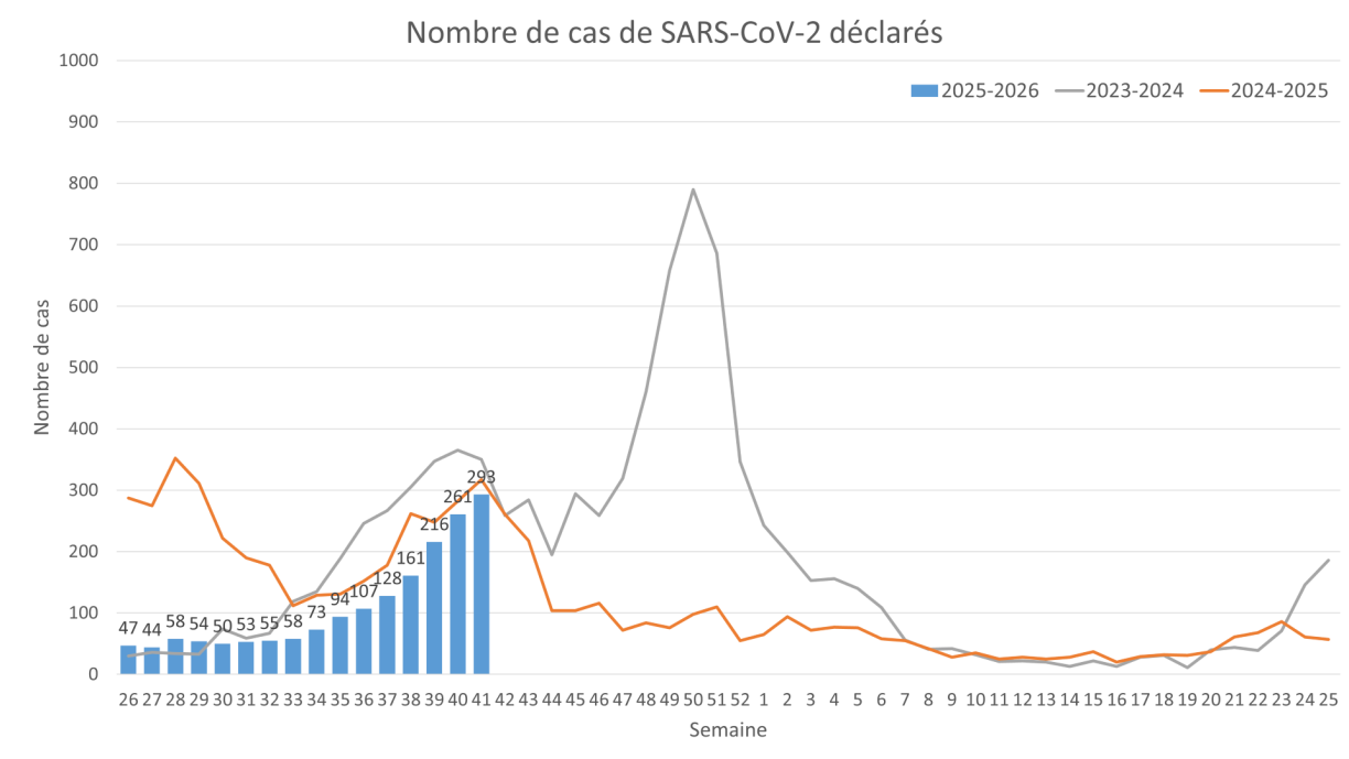 Au cours de la semaine du 6 au 12 octobre 2025, le nombre de cas positifs au SARS-CoV-2 a augmenté, passant de 261 à 293 cas, soit une hausse de 12 % par rapport à la semaine précédente.