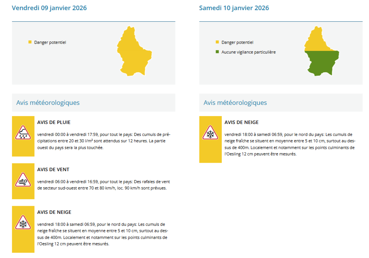Une dégradation météorologique est attendue ce vendredi 9 janvier au Luxembourg, dans un contexte plus large de tempête touchant l’ouest et le nord de la France. Selon les derniers bulletins de Météolux, le pays sera concerné par des précipitations soutenues, des rafales de vent marquées et des chutes de neige qui pourraient être importantes dans le nord du pays en fin de journée.