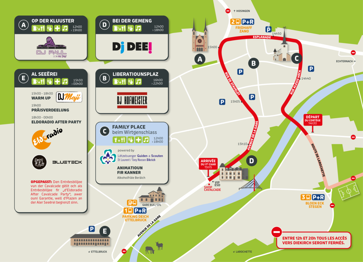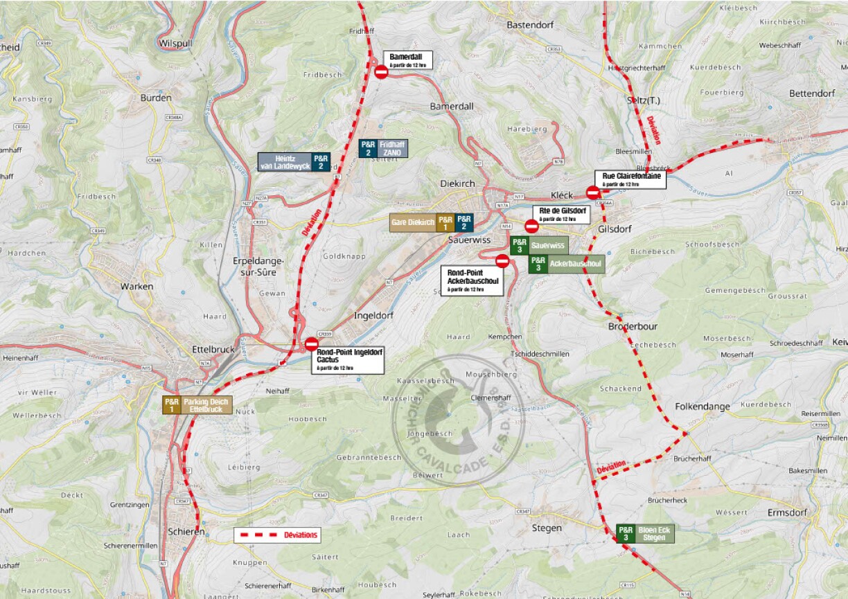 L’accès au centre-ville est fortement limité ce dimanche, il est donc conseillé d’utiliser les différents parkings P&R afin d’arriver en bus sans stresser jusqu’au centre-ville: le parking Däich à Ettelbruck, sur le site de Heintz van Landewyck ainsi que de l’autre côté de la ZANO (près de Fridhaff). D’autres solutions de parking sont proposées un peu partout autour de la ville.