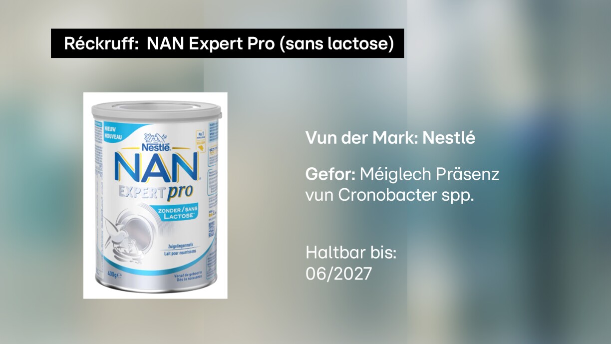 Il s’agit précisément des boîtes de “NAN EXPERT PRO sans lactose” de 400 grammes munies du code-barre: 8445291272521, avec la date de durabilité maximale du 06/2007 et issues du lot L-51520346AC.