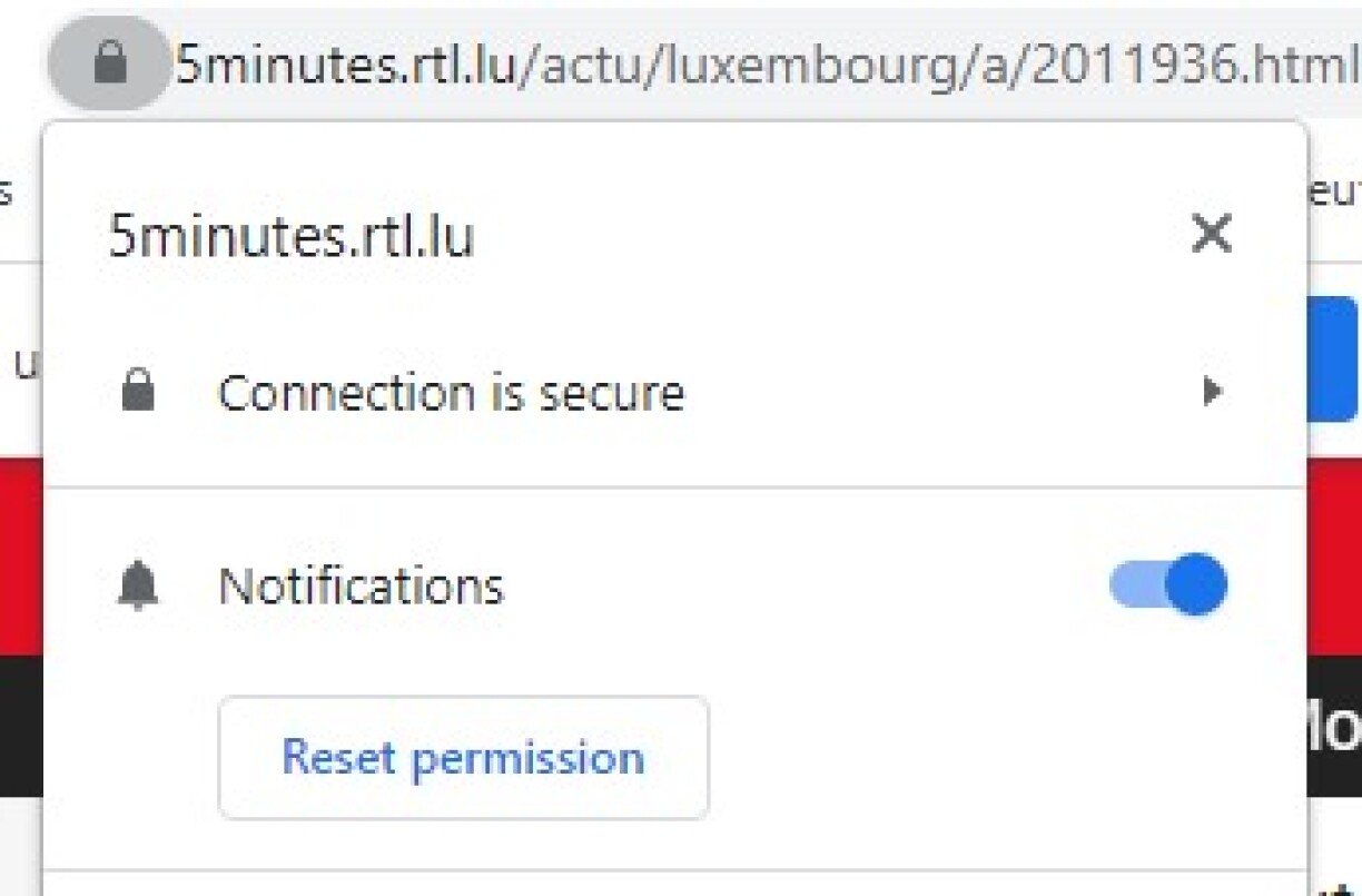 Si vous souhaitez bloquer l'ensemble de nos pushs web (ou ceux de tout autre site), la deuxième option consiste à cliquer sur le symbole du cadenas à gauche de l'URL dans votre navigateur et à désactiver les notifications (voir ci-dessous).