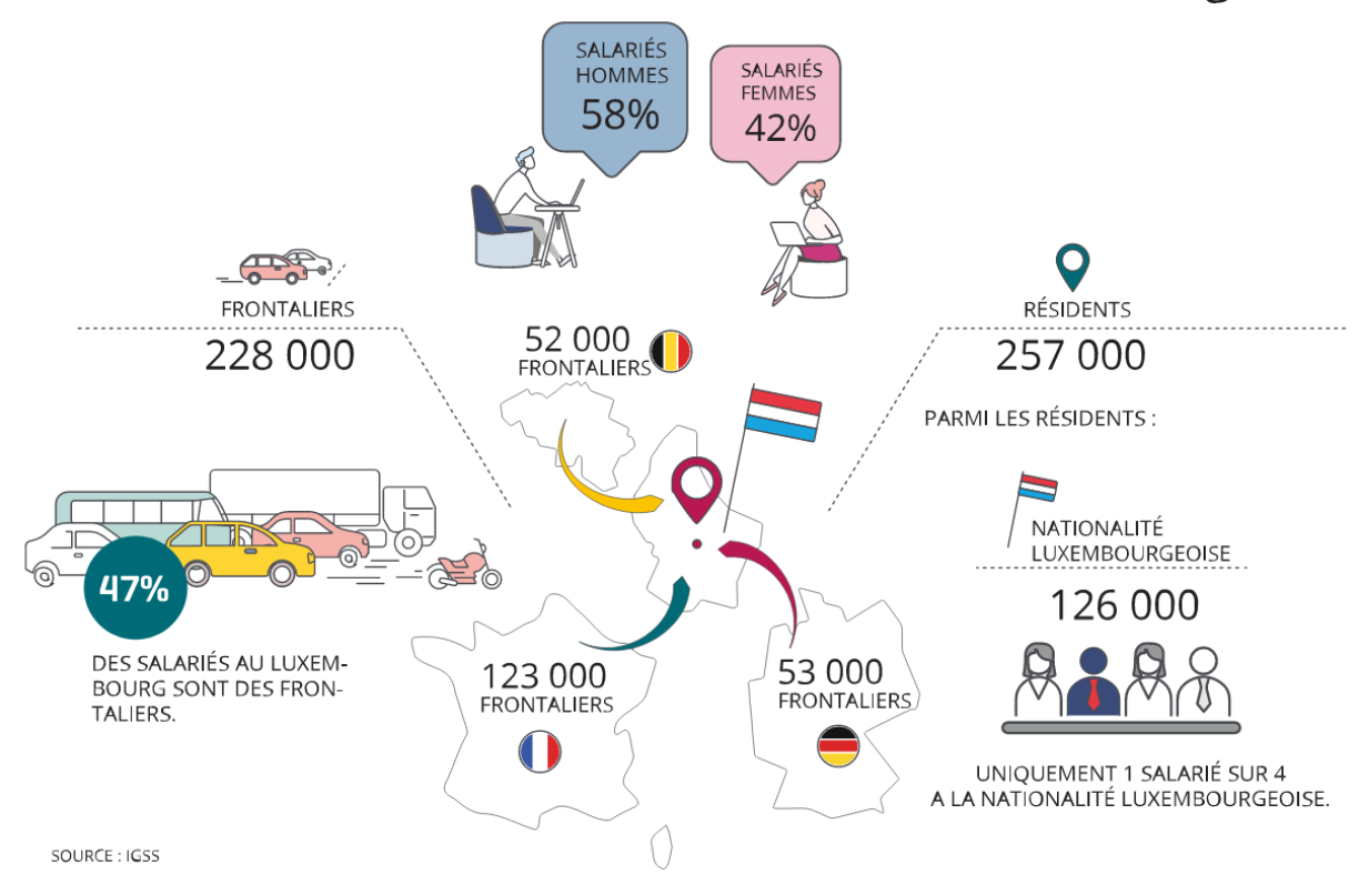 Sur les 485.000 salariés au Luxembourg, 47% sont des frontaliers (dont la moitié en provenance de France). Surtout, un salarié sur quatre seulement a la nationalité luxembourgeoise. Les autres sont soit des résidents étrangers, soit des frontaliers.