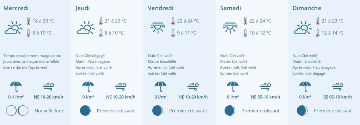 Quelques nuages devraient revenir dimanche mais les températures resteront très agréables. Entre 12 et 14°C le matin puis entre 21 et 23°C l'après-midi. De quoi organiser un petit barbecue ou aller se prélasser en terrasse. À vous de choisir.