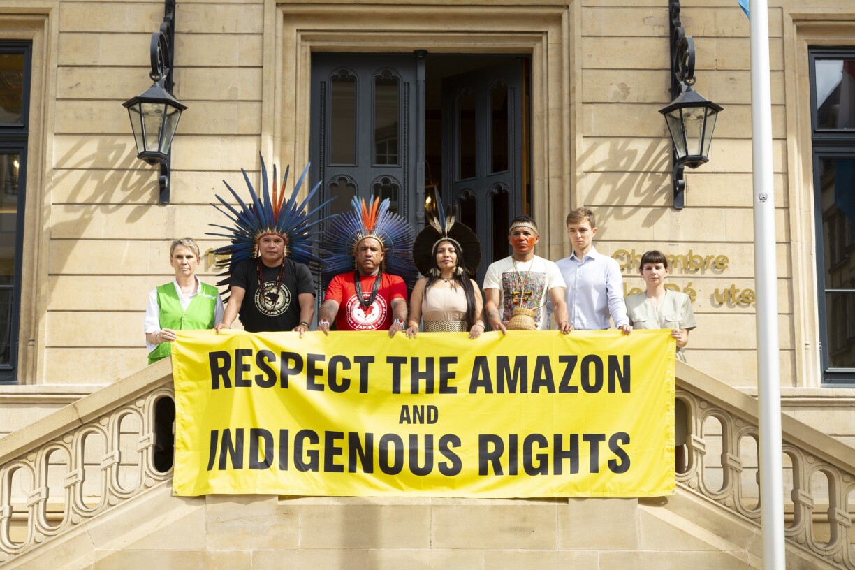 En tournée européenne, quatre représentants et représentantes de l’Articulation des Peuples Autochtones du Brésil (APIB), instance de référence du mouvement autochtone brésilien, ont participé lundi à une action symbolique devant la Chambre des députés au cœur de la capitale luxembourgeoise. Aux côtés de Greenpeace Luxembourg et de membres de la société civile, ils ont appelé à stopper la destruction de l’Amazonie et protéger les droits des peuples qui vivent et dépendent des forêts.