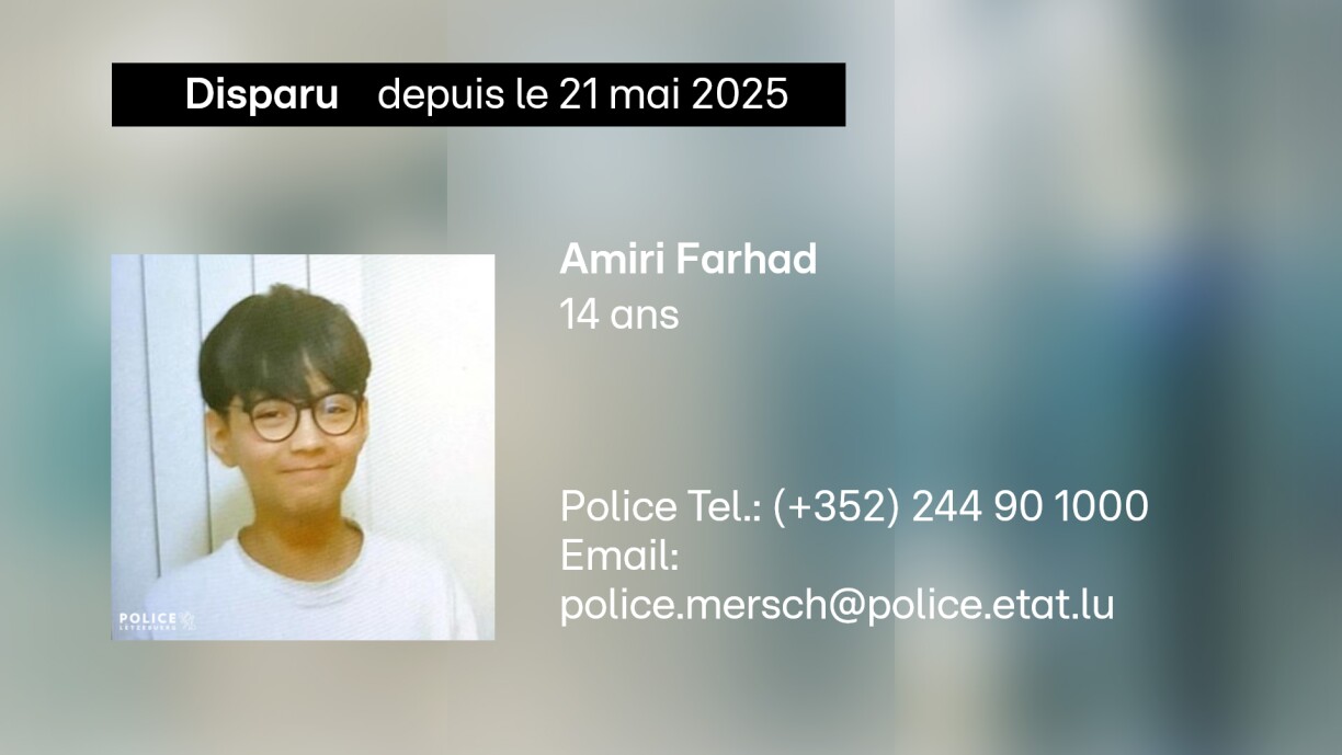 Toute information concernant le lieu où se trouve le disparu doit être communiquée au plus vite au commissariat de police de Mersch par téléphone au (+352) 244 90 1000 ou par e-mail à police.mersch@police.etat.lu.