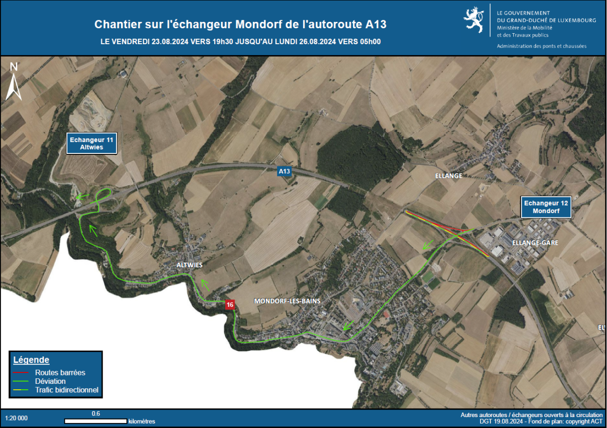 Le trafic en provenance de la N16 et en direction de l’A13 vers Esch-sur-Alzette sera dévié à partir de l’échangeur Mondorf via la N16 et l’échangeur Altwies.