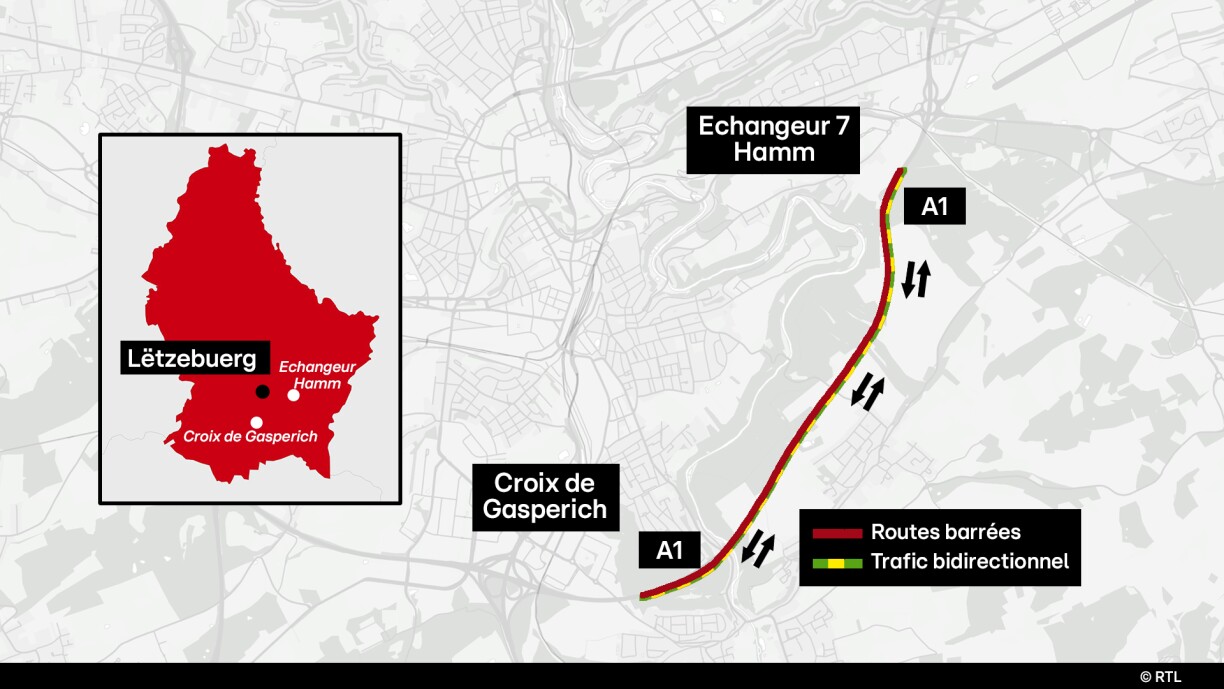 L’autoroute A1 en direction de Luxembourg sera fermée entre l’échangeur Hamm et la croix de Gasperich