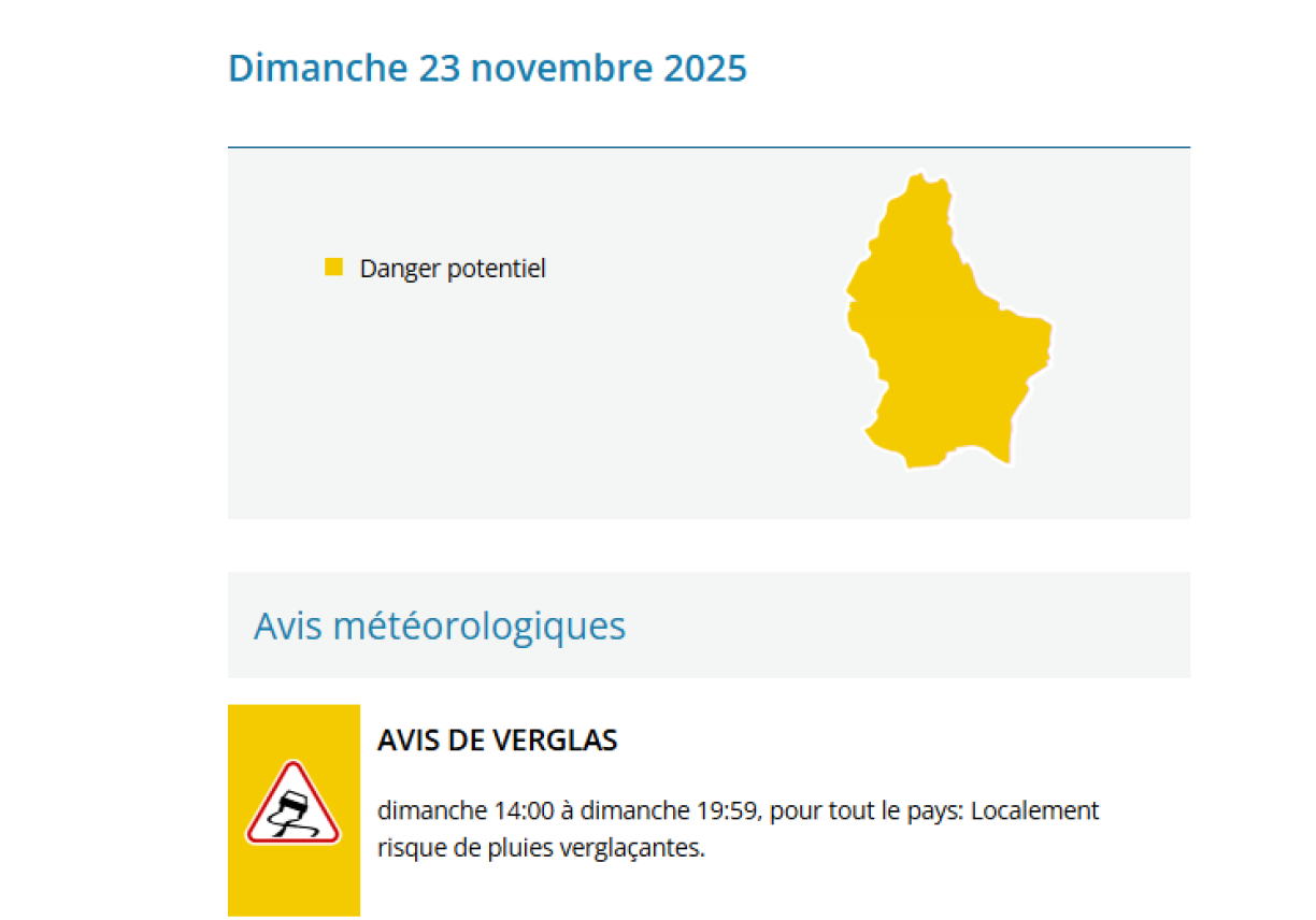 Dimanche au petit matin, Meteolux a émis une vigilance jaune pour tout le pays, synonyme de “danger potentiel”. La mise en garde vaut de 14h à 20h, pour tout le Luxembourg. “Localement risque de pluies verglaçantes”, annonce le portail météo officiel du gouvernement.