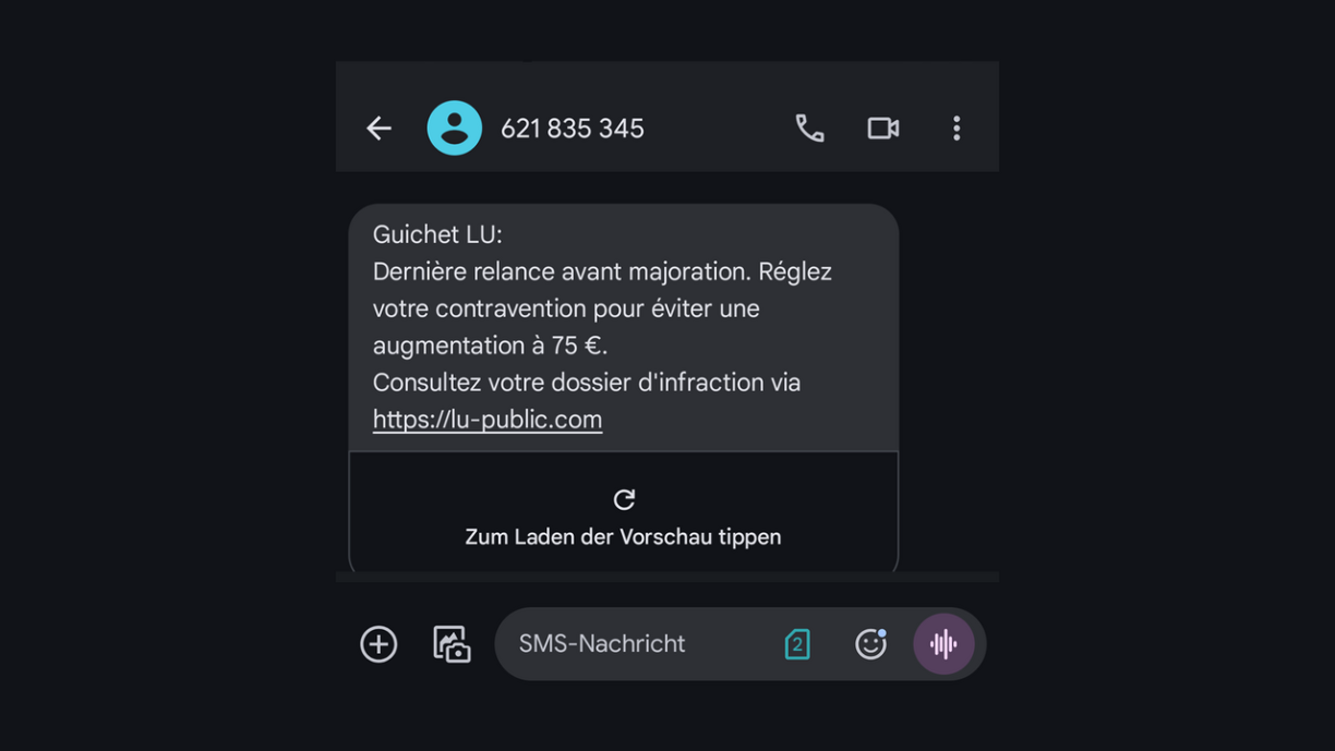 Ces arnaques sont de plus en plus sophistiquées avec des numéros d’envoi luxembourgeois. Le SMS prétend avoir été envoyé par “Guichet.LU” (et non pas Guichet.lu) et demande au destinataire de régler une amende afin d’éviter de devoir payer un supplément qui pourrait alors atteindre les 75 euros.