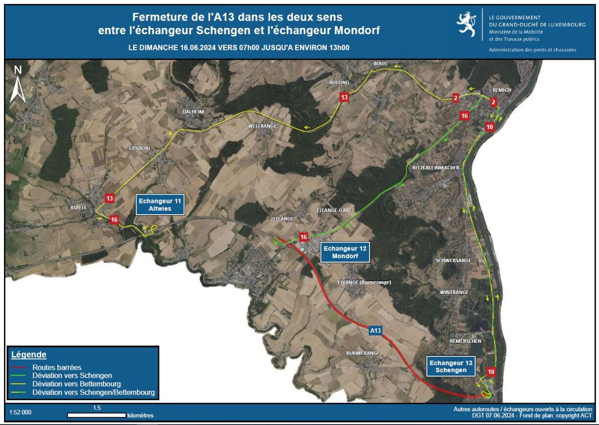 Pour que cet exercice ait lieu, l'A13 devait être fermée dans les deux sens entre l'échangeur Schengen et l'échangeur de Mondorf-les-Bains. Les accès depuis Schengen vers Bettembourg et depuis Mondorf-les-Bains vers la frontière étaient également restreints. Des déviations ont été mises en place via la N10, la N2, la N13 et la N16 jusqu'à l'échangeur d'Altwies pour le trafic en direction de Bettembourg, et via la N16, la N2 et la N10 pour le trafic en direction de Schengen.